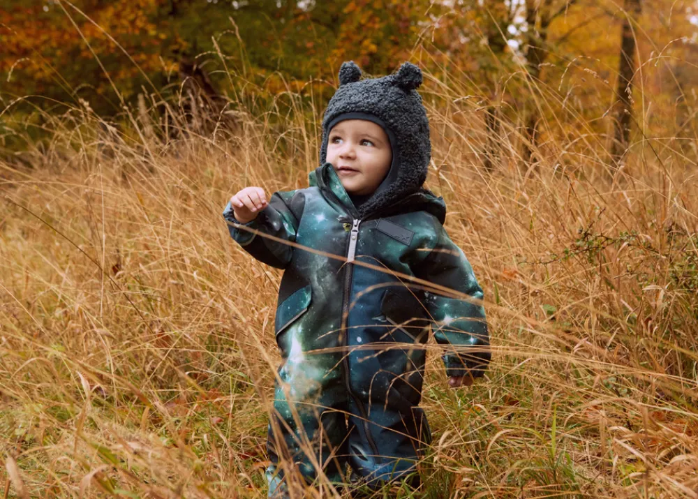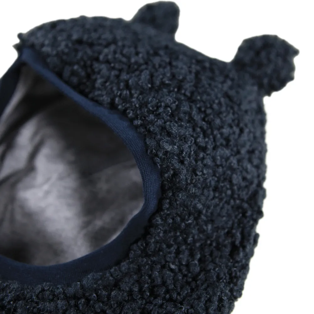 Elefanthue fra Molo i blød teddy-fleece med fine bamseører. Huen dækker både hoved, hals og ører og holder barnet dejligt varmt. Indvendigt er den foret med blød jersey i gråmelange for ekstra komfort.