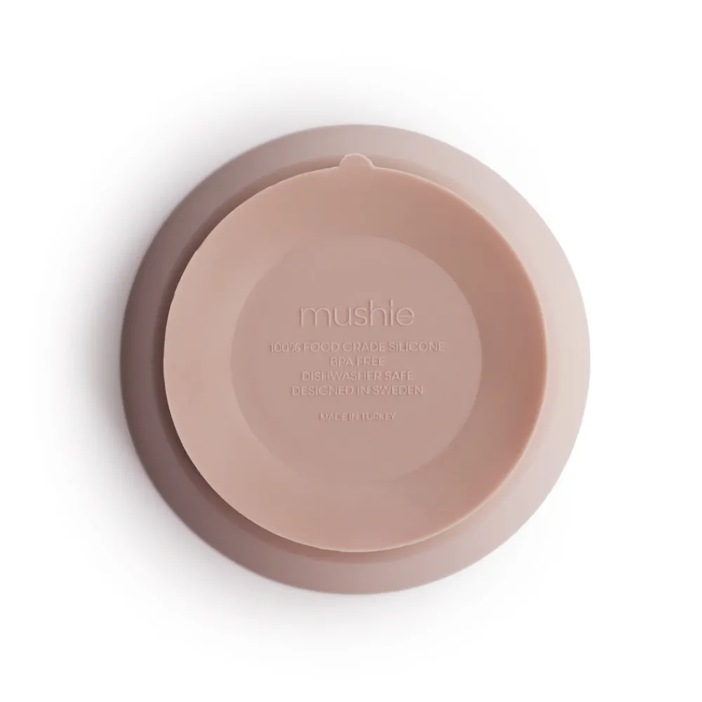 Mushie rund silikoneskål med sugekop. Små børn er impulsive, når de udforsker verden – også under måltiderne. Når man skal lære at spise selv, kan man blive ramt af en uimodståelig trang til at udforske tyngdekraften, og så ender tallerkener, skåle, m.m. på gulvet. Denne silikoneskål fra Mushie er designet til at gøre overgangen til fast føde lidt nemmere for forældrene. Derfor er bunden udstyret med en praktisk sugekop i silikone, så skålen bliver stående på bordet måltidet igennem. Skålen er fremstillet af fødevaregodkendt silikone, der er 100 % fri for bisphenoler og andre skadelige kemikalier. Den tåler ovn, mikroovn, opvaskemaskine og er let at rengøre. Mix og match den med Mushies øvrige dinnerware for at dække det smukkeste bord.