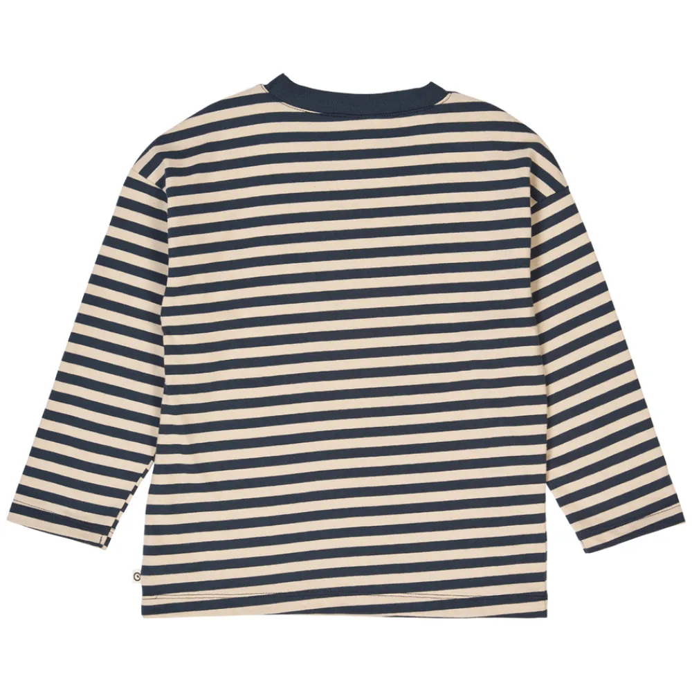 Denne søde langærmede bluse er lavet i en blød og behagelig kvalitet af 100% økologisk bomuld. Den har et klassisk stribemønster i navy og cremefarvet, og den løse pasform giver god bevægelsesfrihed og komfort.
