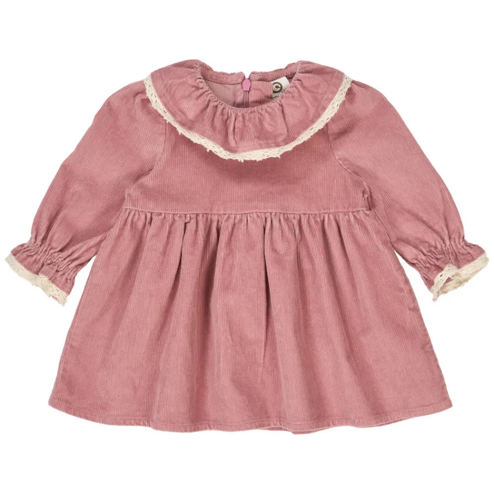 Denne smukke kjole er syet i blød og lækker smalriflet fløjl, som giver et klassisk og behageligt udtryk. Kjolen har lange ærmer med let rynkede afslutninger og en dekorativ krave med fin blondekant, der tilføjer et feminint og nostalgisk præg. Den lukkes i ryggen med en diskret lynlås.