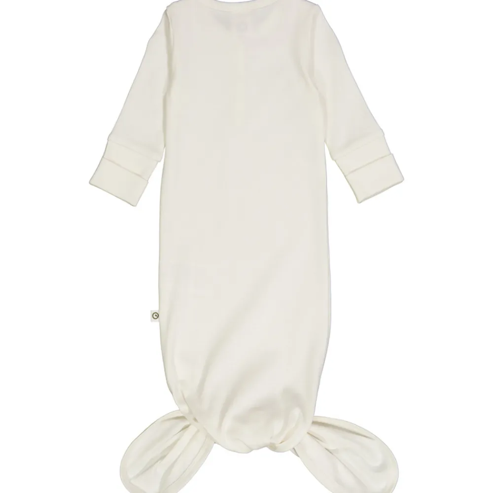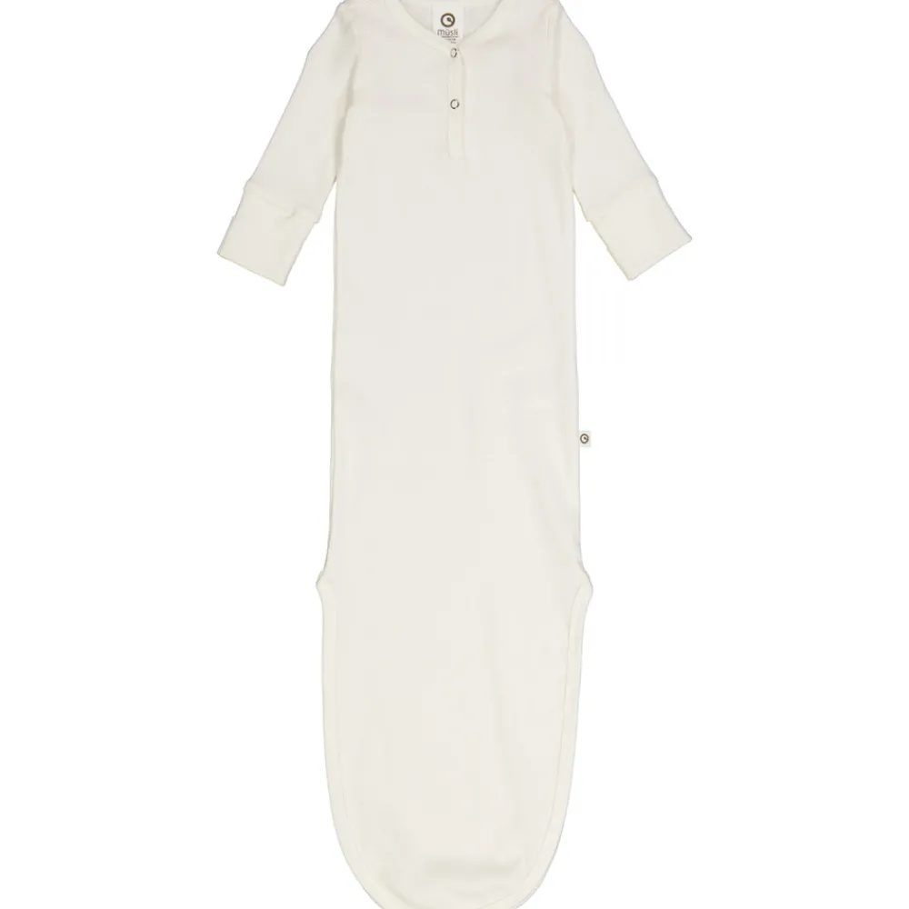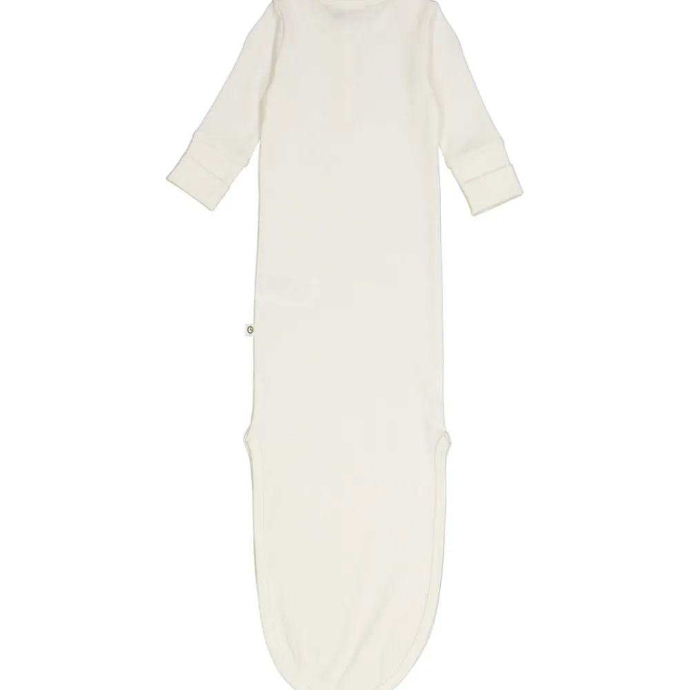 Skøn og blød ribbet soveposedragt med knude lukning i bunden Knuden ved den lilles fødder gør det nemt med hyppige bleskift. Specielt smart om natten hvor man ikke vil vække baby mere end højest nødvendigt. Der er ydermere vendbare hænder, så man kan holde babys hænder inde i dragten. Brug den til at give ekstra tryghed, som sovepose en varm sommerdag, eller hvor den passer ind for jer. Den tilpasser sig barnet, og giver en omsvøbende effekt. Ribstrikken giver en dejlig elastisk fornemmelse, der smyger sig om baby og holder formen. Fremstillet i bomulds-rib med elastan for bedst mulig pasform og komfort. (GOTS Organic Certified by Ecocert Greenlife Lic. No. 152033). Produktet er GOTS organic- certificeret, hvilket betyder at bomulden er certificeret økologisk, og at der i alle andre processer som farvning, strikning og syning er taget de strengeste hensyn til miljøet. GOTS er internationalt anerkendt som den førende standard for forarbejdning af tekstiler af økologisk bomuld. Derudover tages der også hensyn til arbejdsforholdene, hos dem der producerer tøjet. Økologisk bomuld 95%, Elastan 5%