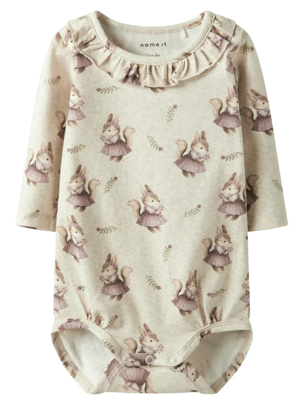 Shelly Langærmet Body fra NAME IT i farven Peyote melange er et skønt valg til de mindste. Den bløde bomuldskvalitet sikrer komfort hele dagen, og det søde print med små egern i kjole giver et charmerende udtryk. Bodyen har en fin flæsekant ved halsen, som tilføjer et feminint touch, og de lange ærmer sørger for, at barnet holdes varmt. Praktiske trykknapper i bunden gør det nemt at skifte ble, og den elastiske halsudskæring gør påklædningen let. Perfekt til både hverdag og festlige lejligheder, hvor komfort og stil går hånd i hånd.