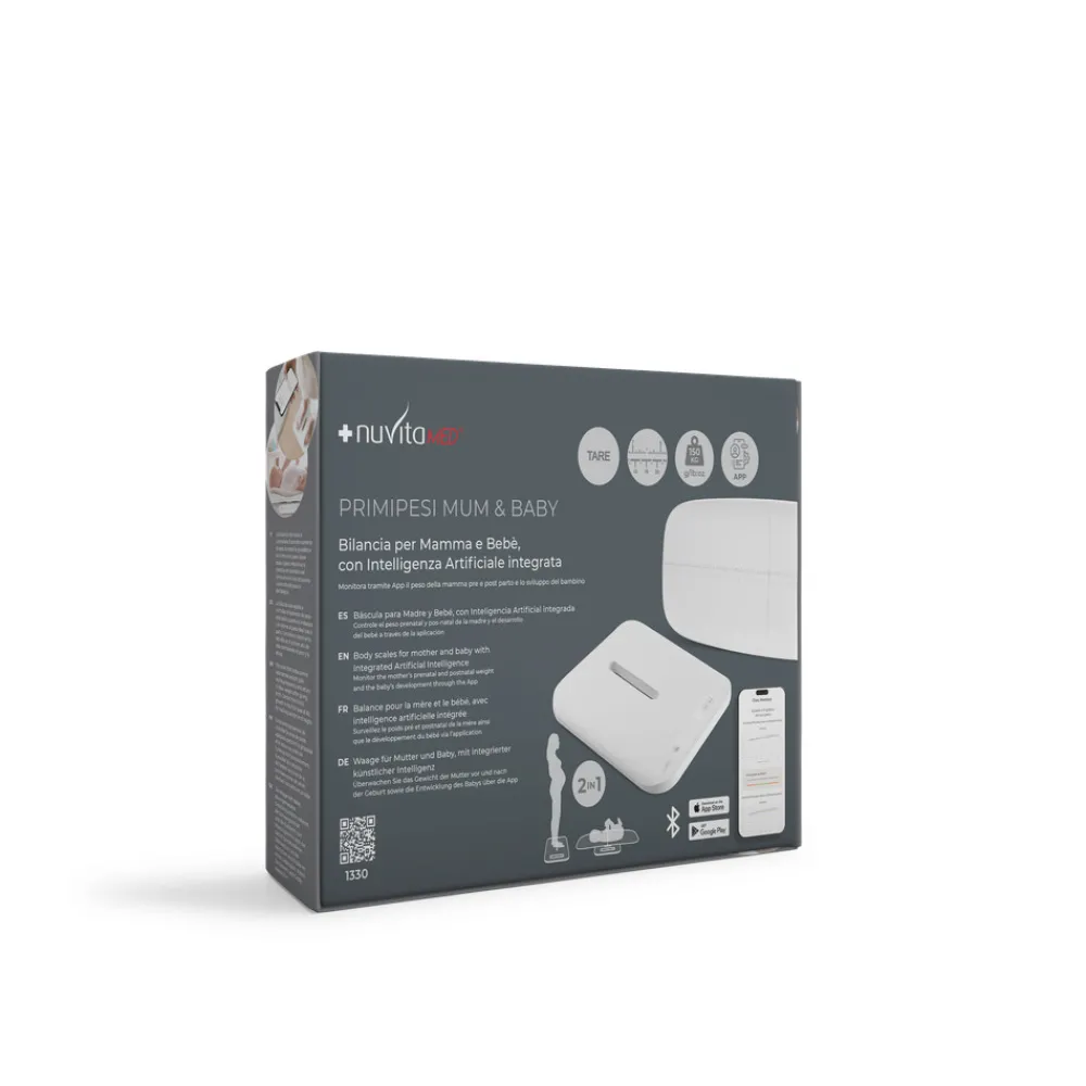 Præsentation af PrimiPesi Mum & Baby fra Nuvita – den revolutionerende vægt med integreret kunstig intelligens, designet til at overvåge moderens vægt før og efter fødslen samt barnets udvikling fra fødslen og frem via en dedikeret app, tilgængelig på både iOS og Android.