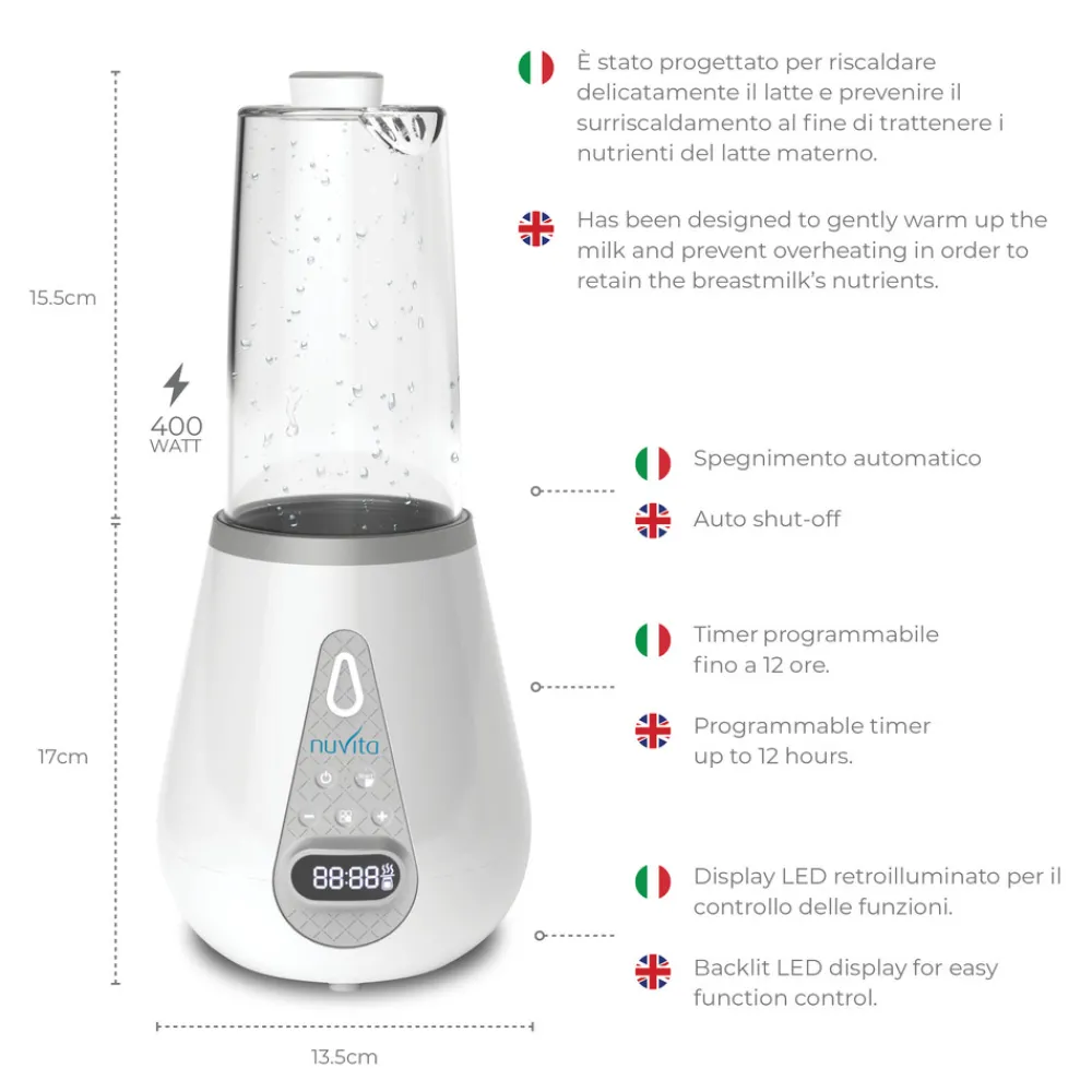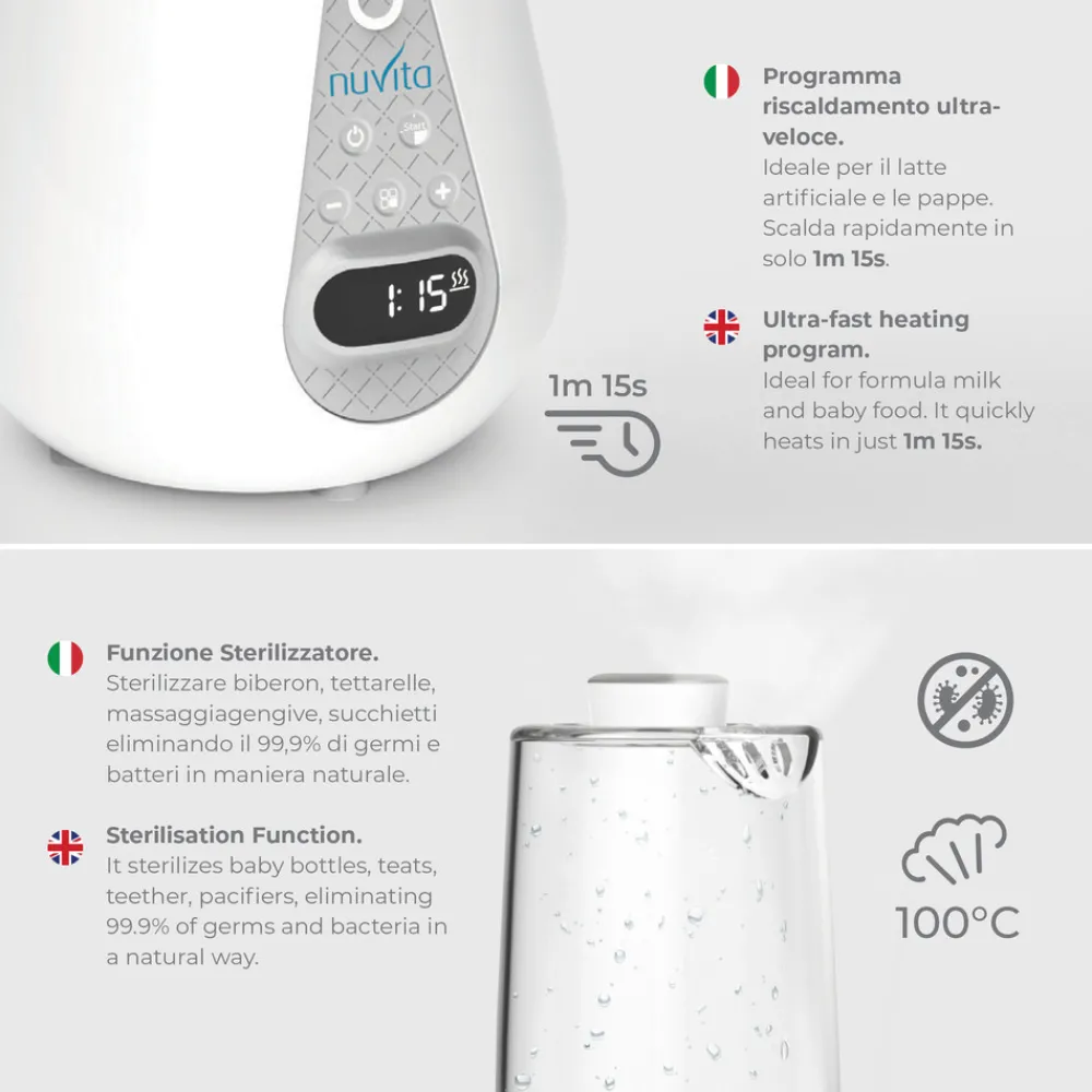 Ultrahurtig og programmerbar, den opvarmes og afrimes gradvist, og takket være det medfølgende specielle låg bliver den til en praktisk sterilisator. LED-displayet er let at læse takket være ikonerne, der angiver det valgte program. Det er ekstremt sikkert og kan fungere kontinuerligt cyklus uden behov for at lade apparatet køle ned mellem en opvarmning og en anden. Kompakt design, bygget i solidt og raffineret ABS-materiale, velegnet til opvarmning af sutteflasker i alle størrelser og materialer. Det giver mulighed for at opvarme i 2 forskellige tilstande.