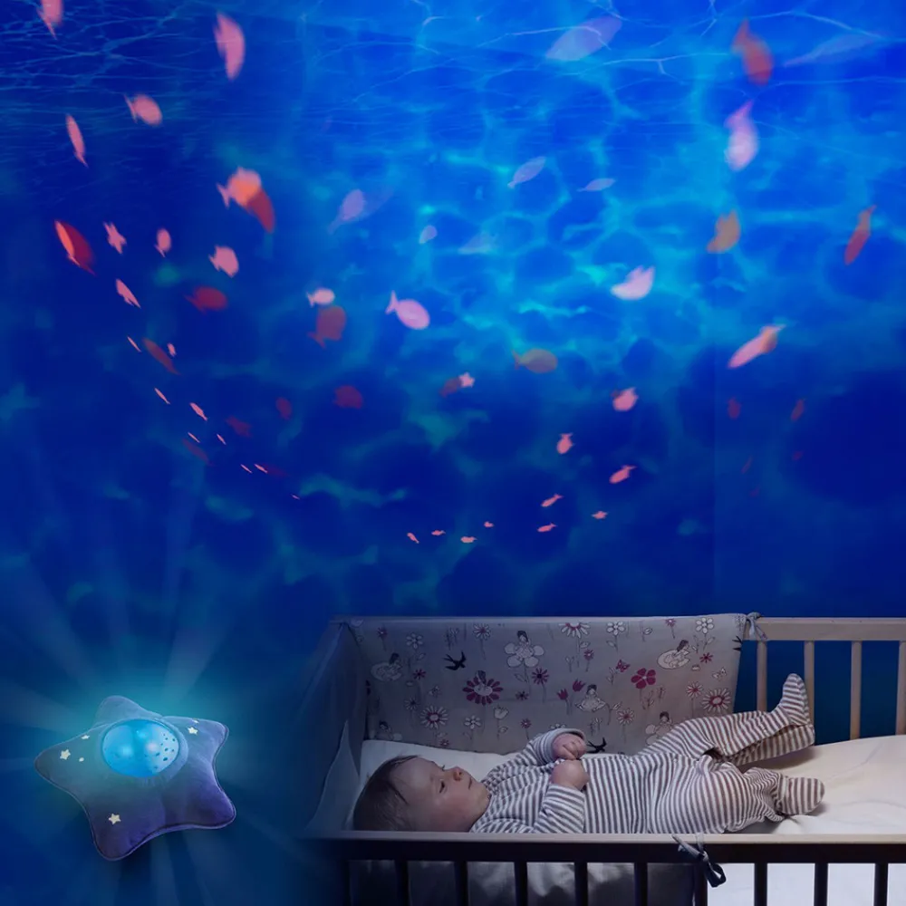 Med Pabobo Dynamic Undervands Projector kan barnet falde i søvn til fisk og beroligende lyde fra et roligt hav, såkaldt “hvid støj”. En innovativ natlampe, med den nyeste teknologi og lyd, lys og billede. Den seneste forskning viser, at børn falder lettere i søvn til en svag baggrundslyd, såkaldt hvid støj. Den har Pabobo Dynamic Undervands Projector. Natlampen har tre forskellige programmer, der hjælper barnet med at falde trygt i søvn om aftenen, eller falde i søvn igen, når barnet vågner om natten. Hvert program har sin egen kombination af lyde, rytmer og intensitet. Som forældre vælger I det program, der passer jeres barn bedst til at sove, så husker lampen det valgte program. Vælg mellem rolige vuggeviser og lyden af et roligt hav. At have den samme sengetidsrutine nat efter nat er et velkendt tip til at få små børn til at sove. Med Pabobo Dynamic Undervands Projector skal du blot trykke på knappen, når du lægger dig ned, for at starte natten med det valgte program, der bliver en del af barnets natterutine. Programmerne er af forskellig længde, “Quiet Child” er på 20 minutter og “Restless Child” er på 40 minutter, begge med en kombination af dæmpet lys, beroligende lyde og et smukt undervandsmiljø, der langsomt bevæger sig dynamisk fra to forskellige retninger. Det tredje program “Baby Cry Sensor” starter, hvis baby vågner om natten, og giver en beroligende lyd, der ligner lyden af morens mave.