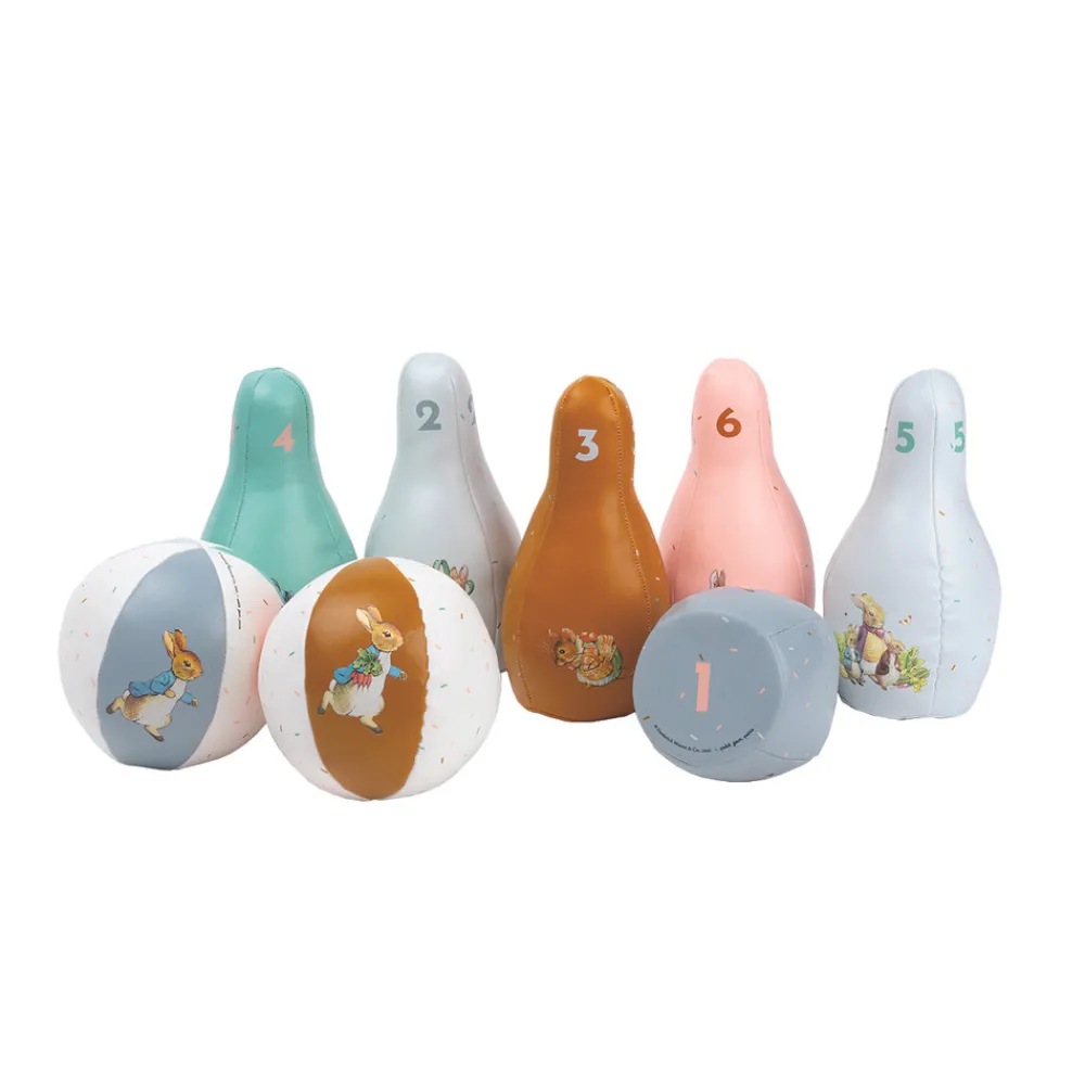 Med det sjove bowlingsæt fra Petit Jour kan barnet øve motorikken, når der skal væltes kegler med den bløde bold.