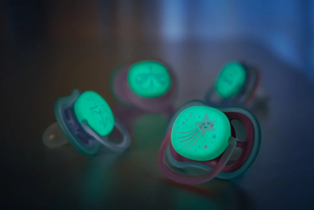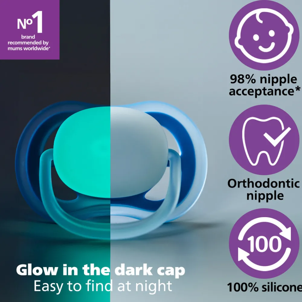 En let, åndbar sut – der lyser i mørket. Lul din baby med en sut, der lader huden ånde og er nem at finde om natten. Philips Avent ultra air nat har ekstra store huller til at holde huden tør og en lys-i-mørke-knap, så både du og din elskede kan se og finde den, selv i mørke. Philips Avent symmetriske suttehoved respekterer den naturlige form af din babys gane, tænder og tandkød. Den er også ekstra fast, hvilket gør den ideel til voksende mund. Da Philips Avent spurgte mødre, hvordan deres små reagerer på deres teksturerede silikone suttehoveder, sagde i gennemsnit 98 %, at deres baby accepterer Philips Avent Ultra Air. 2 pak inkl. sterilisator boks til mikroovn. Ortodontisk og BPA-fri.
