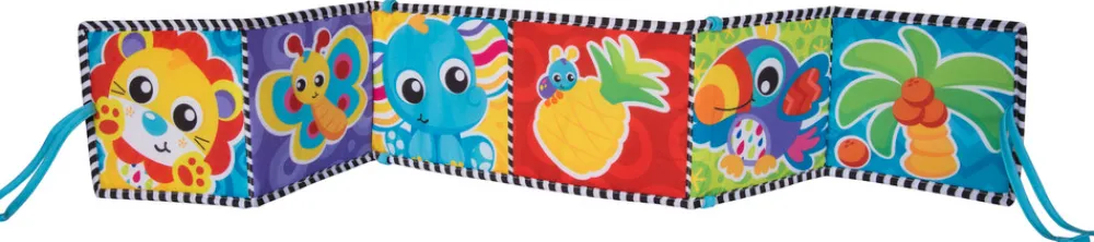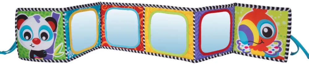 Sjov og lærerig barnevognsrand med 4 spejle på den ene side og farverige dyr på den anden.