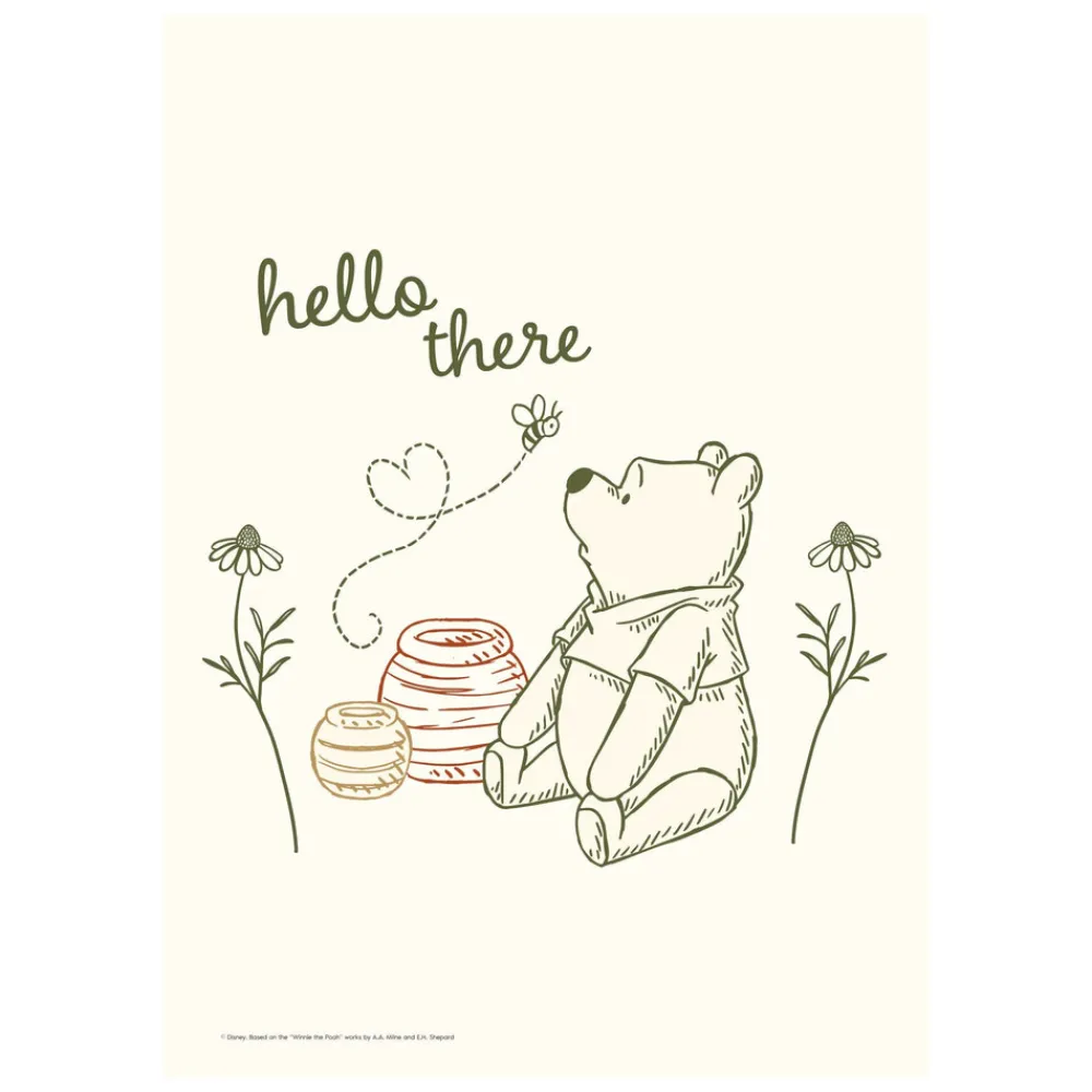 Giv børneværelset et hyggeligt og eventyrligt præg med denne fine plakat med Peter Plys fra Poster & Frame. Motivet forestiller den elskede bjørn i et enkelt og charmerende design, hvor han sidder omgivet af honningkrukker og blomster, mens teksten “hello there” byder velkommen. De bløde, neutrale farver gør plakaten nem at matche med andre dekorationer, og den passer perfekt ind i både klassiske og moderne indretninger. Plakaten er trykt på kraftigt papir, så den holder sig flot længe, og er en oplagt gaveidé til både børn og barnlige sjæle, der elsker de tidløse fortællinger om Peter Plys og hans venner.