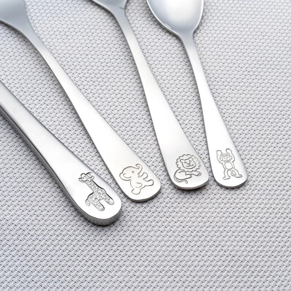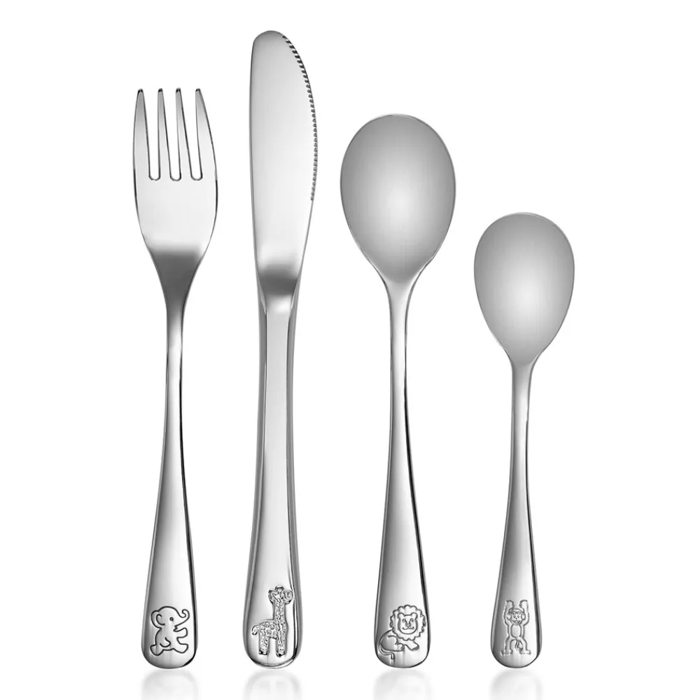 Dette flotte sæt er lavet af rustfrit stål og er formet så det er let for børn at holde om.