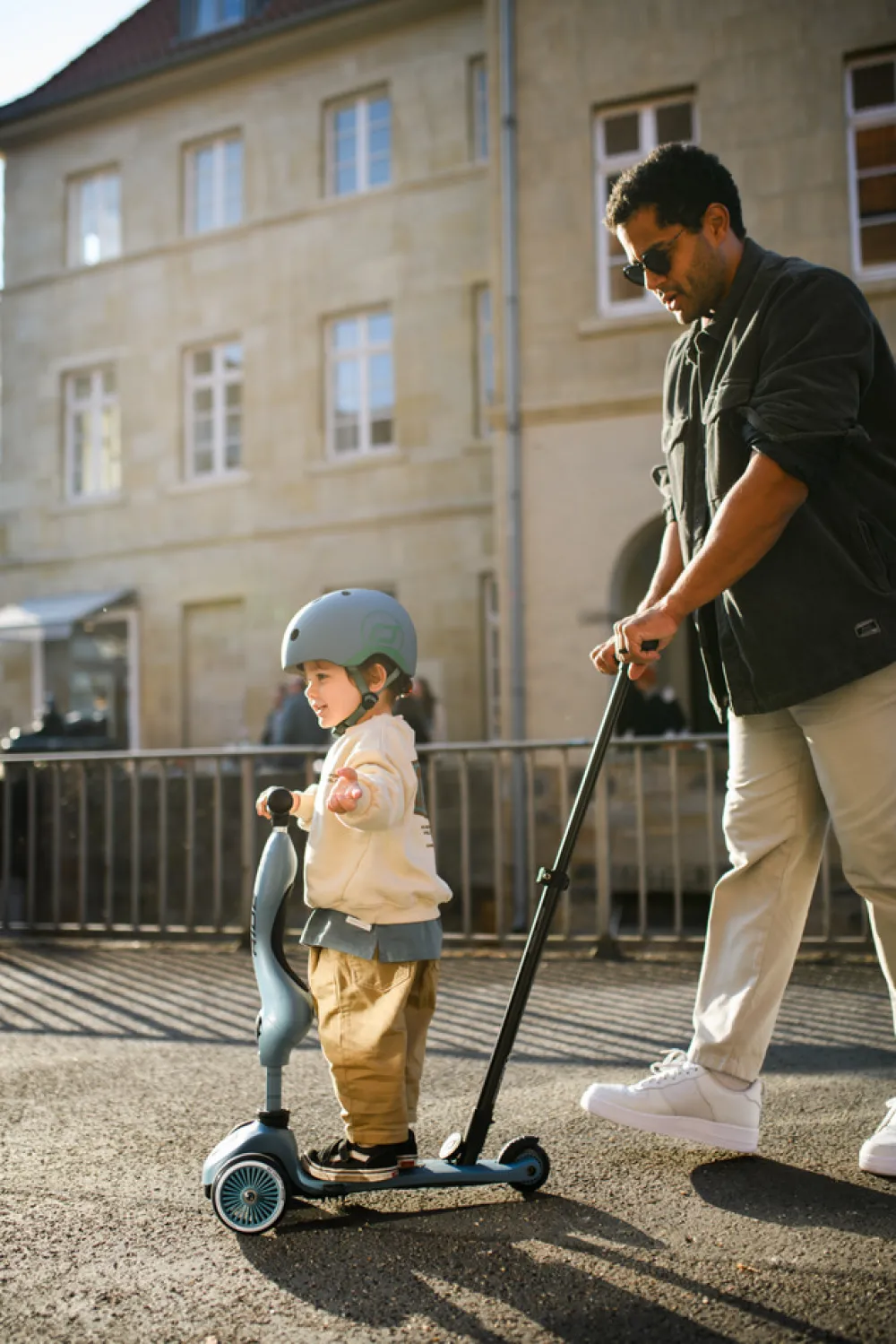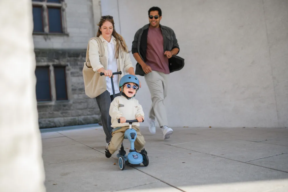 Highwaykick 1 Push&Go kombinerer alle fordelene fra Highwaykick 1 med en ny, vigtig funktion – skubbehåndtaget til forældre. Nu er det muligt at skubbe børn i alderen et til tre år på en komfortabel måde, både når de sidder og står. Det praktiske skubbehåndtag kan fastgøres til fodbrættet på løbehjulet uden brug af værktøj, og kan justeres i tre forskellige højder.