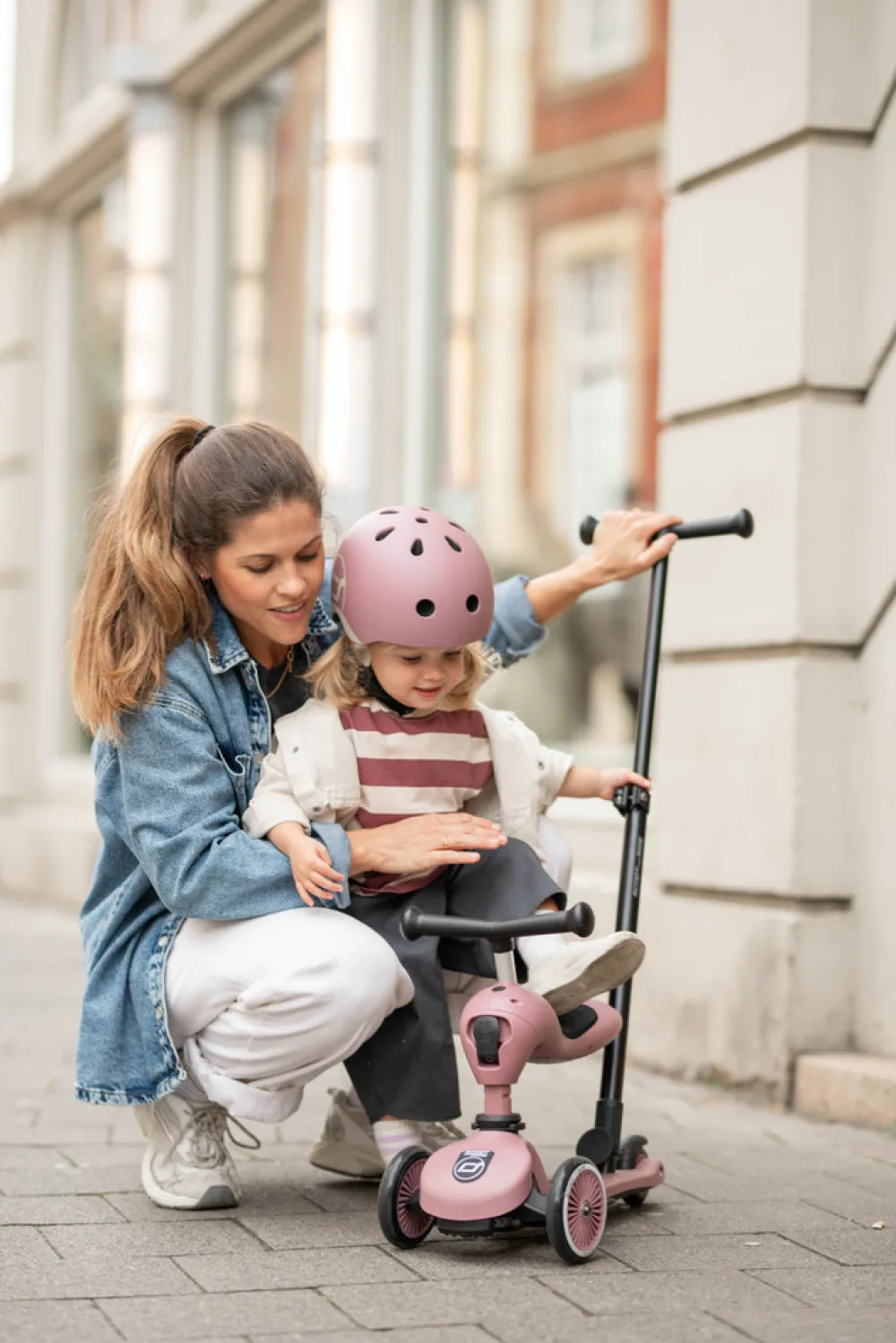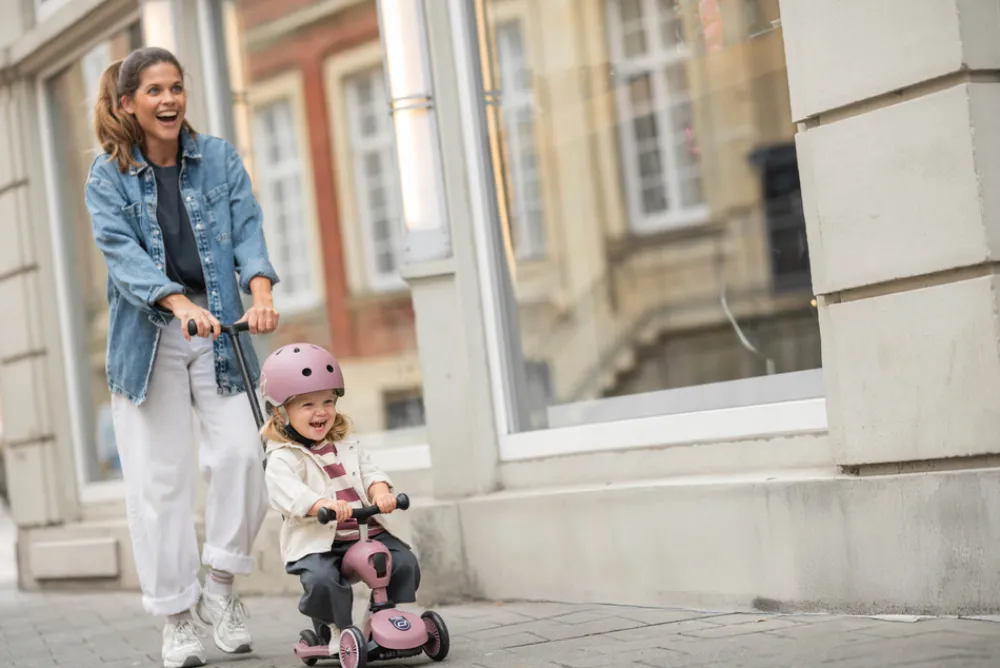 Highwaykick 1 Push&Go kombinerer alle fordelene fra Highwaykick 1 med en ny, vigtig funktion – skubbehåndtaget til forældre. Nu er det muligt at skubbe børn i alderen et til tre år på en komfortabel måde, både når de sidder og står. Det praktiske skubbehåndtag kan fastgøres til fodbrættet på løbehjulet uden brug af værktøj, og kan justeres i tre forskellige højder.