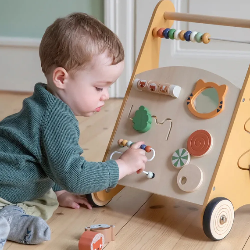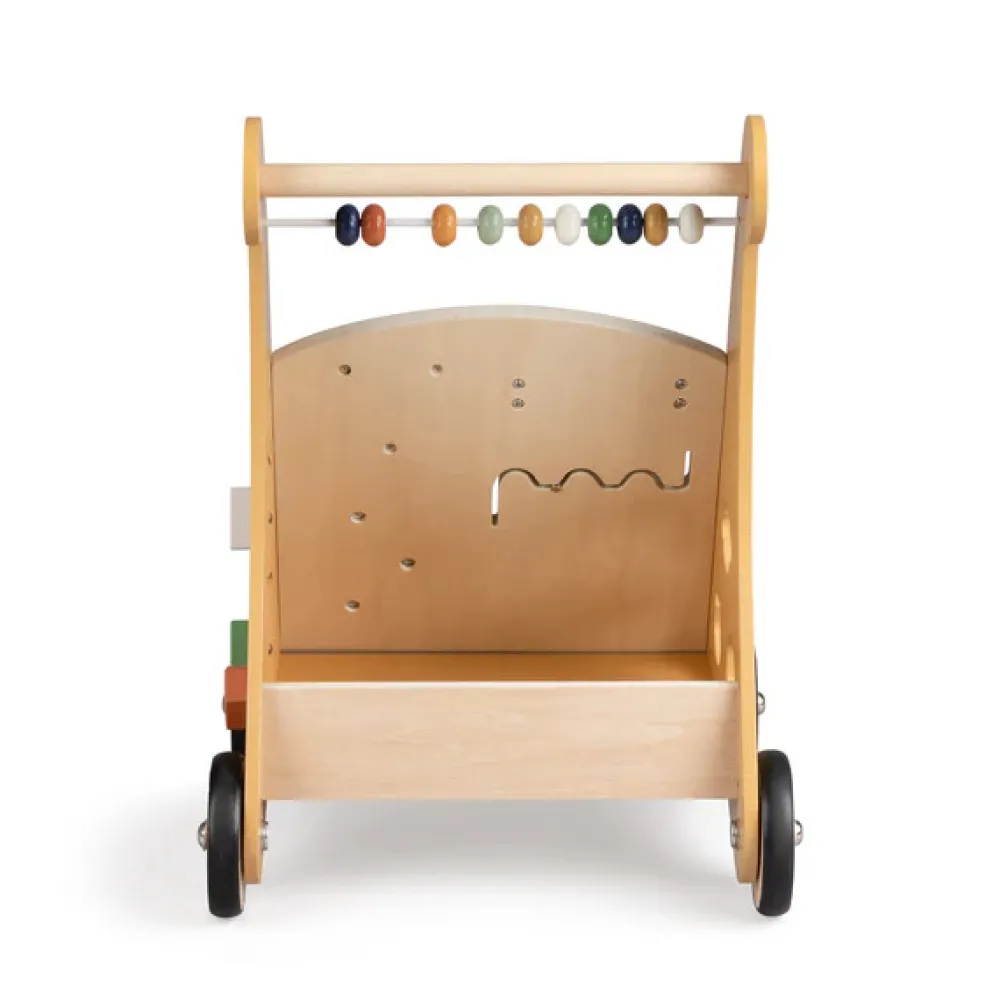 Gåvognen indeholder 8 forskellige aktiviteter. Tæl træperlerne på kuglerammen, spil tre på stribe, eller kig i det babysikre spejl. På den ene side af gåvognen er der en indbygget puttekasse, hvor de medfølgende træfigurer kan placeres gennem de tilpassede huller.