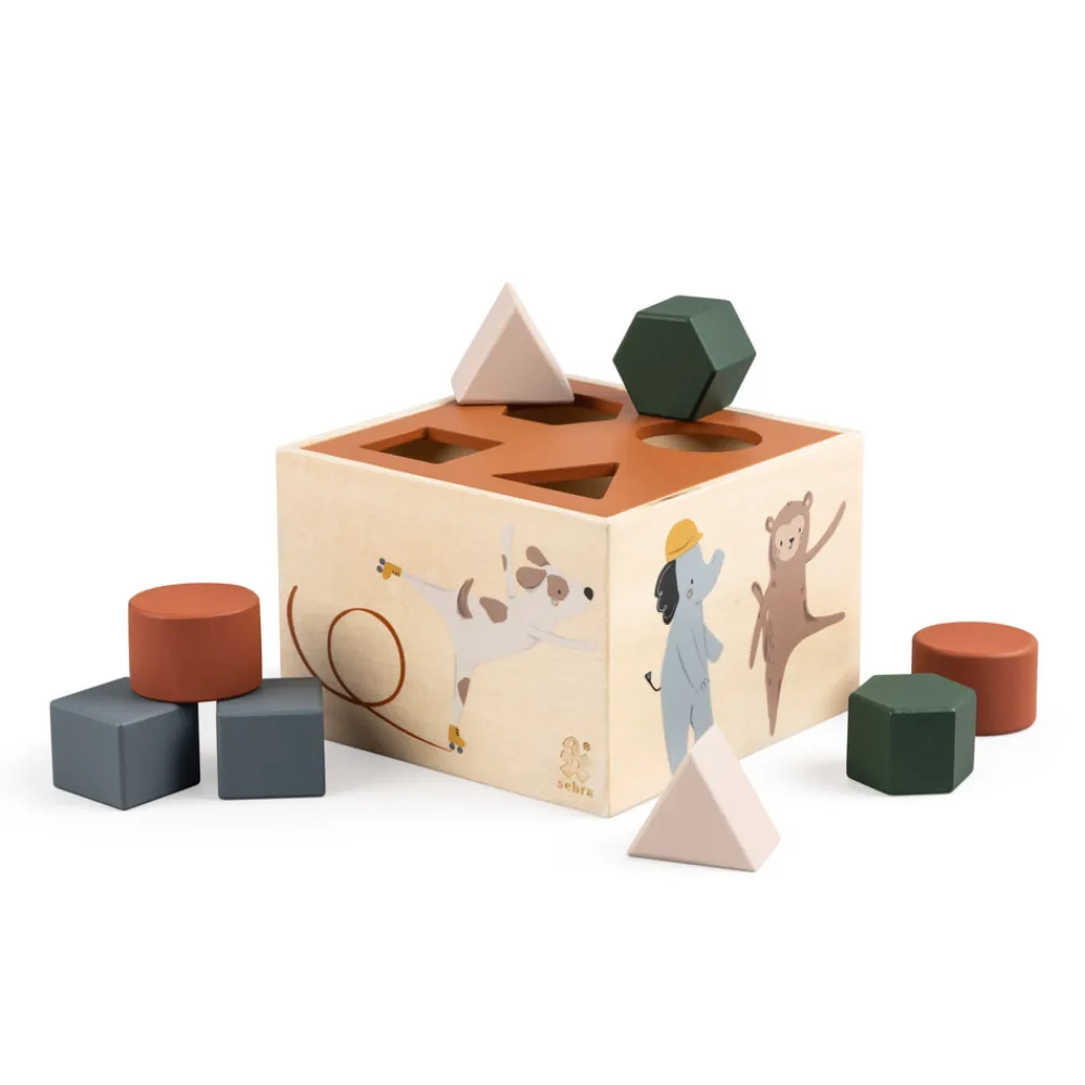Sjov puttekasse i træ med motiver fra Sebras to temaer: Busy Builders og Teeny Toes. Kassen har et let aftageligt låg med fire huller, formet som forskellige geometriske figurer, hvor barnet kan putte de otte medfølgende klodser igennem.
