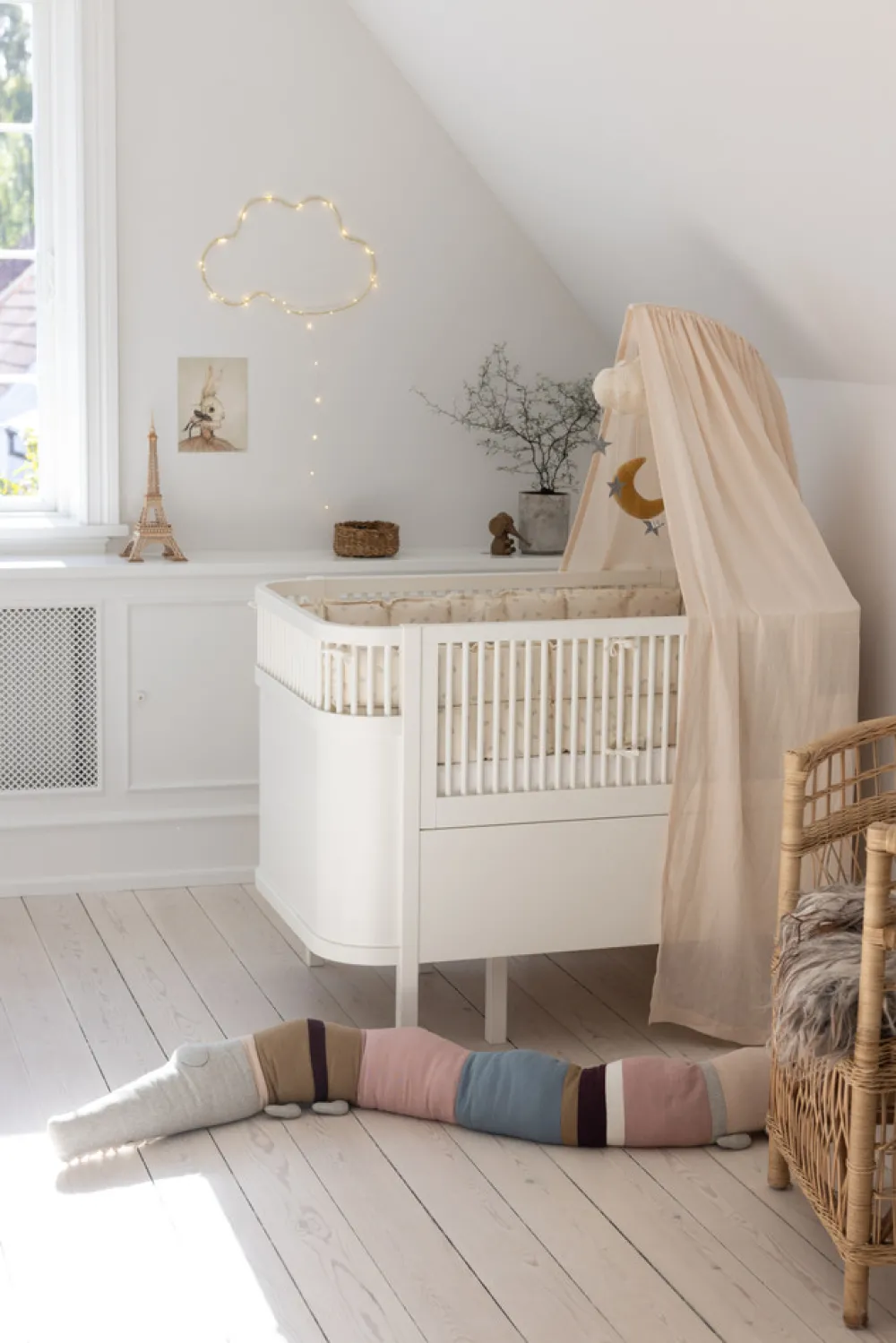 Sengehimlen er designet, så den kan trækkes på en Sebra uroholder og derved komme tættere på sengen, på samme måde som du kender det fra en vugge med himmel. Sengehimlen er fremstillet i en elegant dobby-vævning af 100% certificeret, økologisk bomuld, der kan vaskes ved 40 ℃. Den lette kvalitet sikrer, at luften kan cirkulere frit, hvilket gør sengehimlen både praktisk og smuk. Sengehimlen er ideel til at skabe et afskærmet og roligt sovemiljø for dit barn. Den er designet i Danmark og tilgængelig i flere smukke farver, der matcher Sebras øvrige tekstiler som sengetøj, lagner og sengerande.