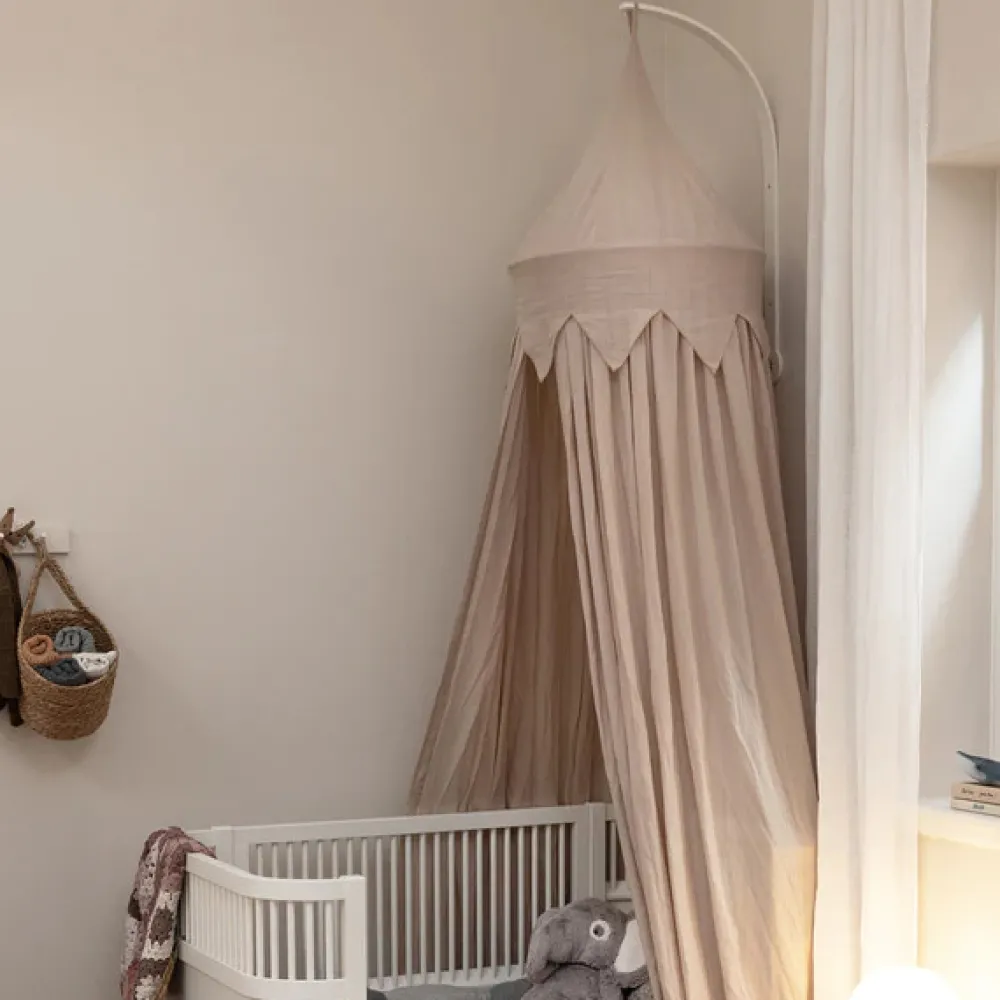 Den vægmonterede sengehimmelholder kan let monteres med de to medfølgende skruer. Skruerne er lakeret hvide, så de matcher holderen og derved giver sengehimmelholderen et fuldendt look. Hæng en sengehimmel op og skab et hyggeligt og trygt sovemiljø for den lille, hvor der er afskærmet for forstyrrende sanseindtryk. Hvis du har højt til loftet eller ikke ønsker at bore huller i loftet, er den vægmonterede holder perfekt. Den er udført i hvidlakeret træ og 72 cm lang. Designet i Danmark.