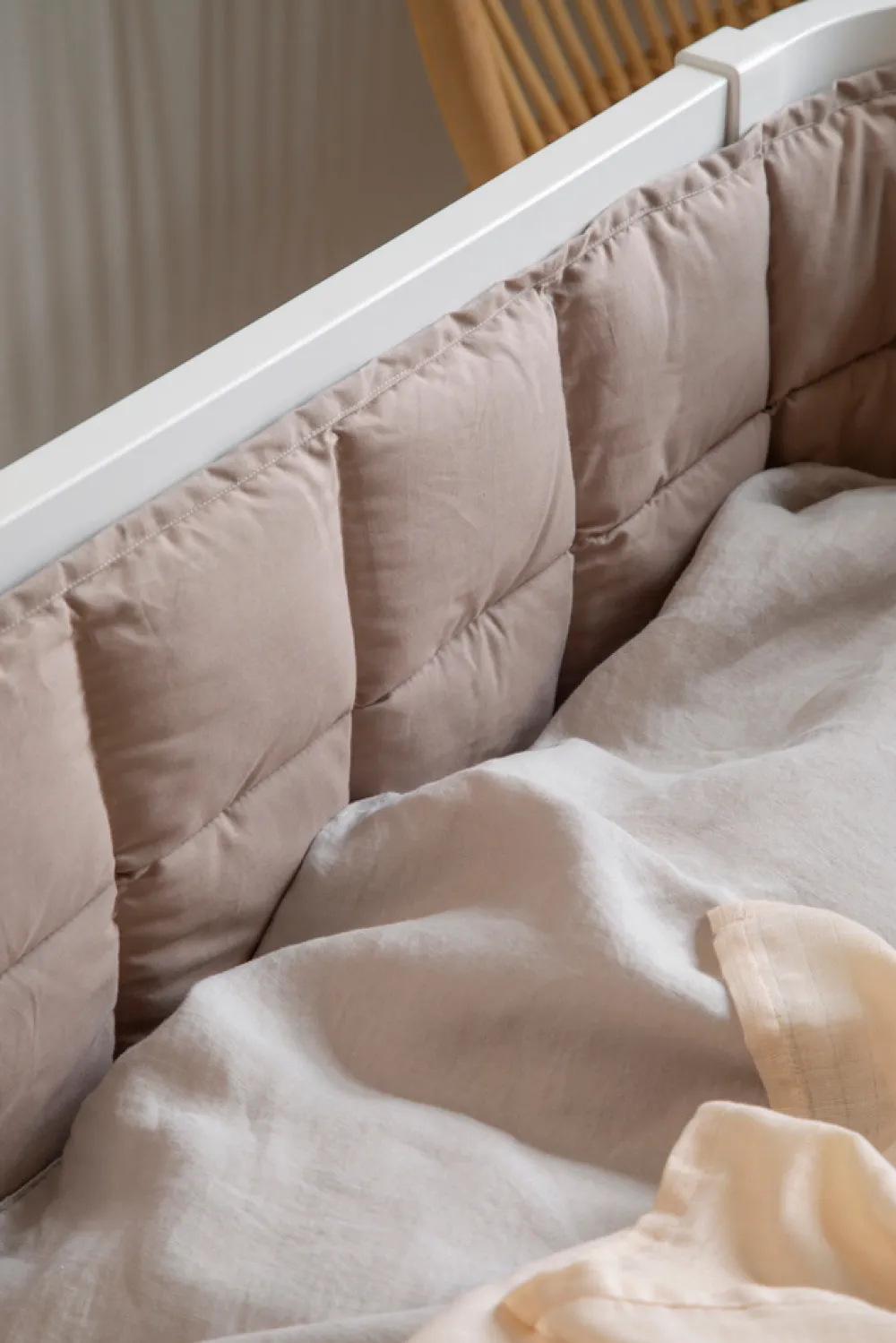 Sengeranden er godkendt og testet for åndbarhed.Sengeranden må kun bruges i barnesengens øverste position.Bindebåndene skal bindes og justeres med en knude på ydersiden af barnesengen.Af sikkerhedsmæssige årsager må der ikke laves en løkke.Sengeranden skal fastgøres med bundne knuder. I tilfælde, hvor bindebåndene i bunden af sengeranden ikke bliver brugt, skal disse klippes helt af således at babyen ikke kan komme i kontakt med dem.Funktionelle snore må ikke klippes af på grund af risikoen for optrevling.Stop med at bruge sengeranden ved de første tegn på skade.Anbefalet alder: 0-6 måneder.Sengeranden er testet og godkendt i henhold til EN 16780:2018 Tekstile børneomsorgsprodukter.
