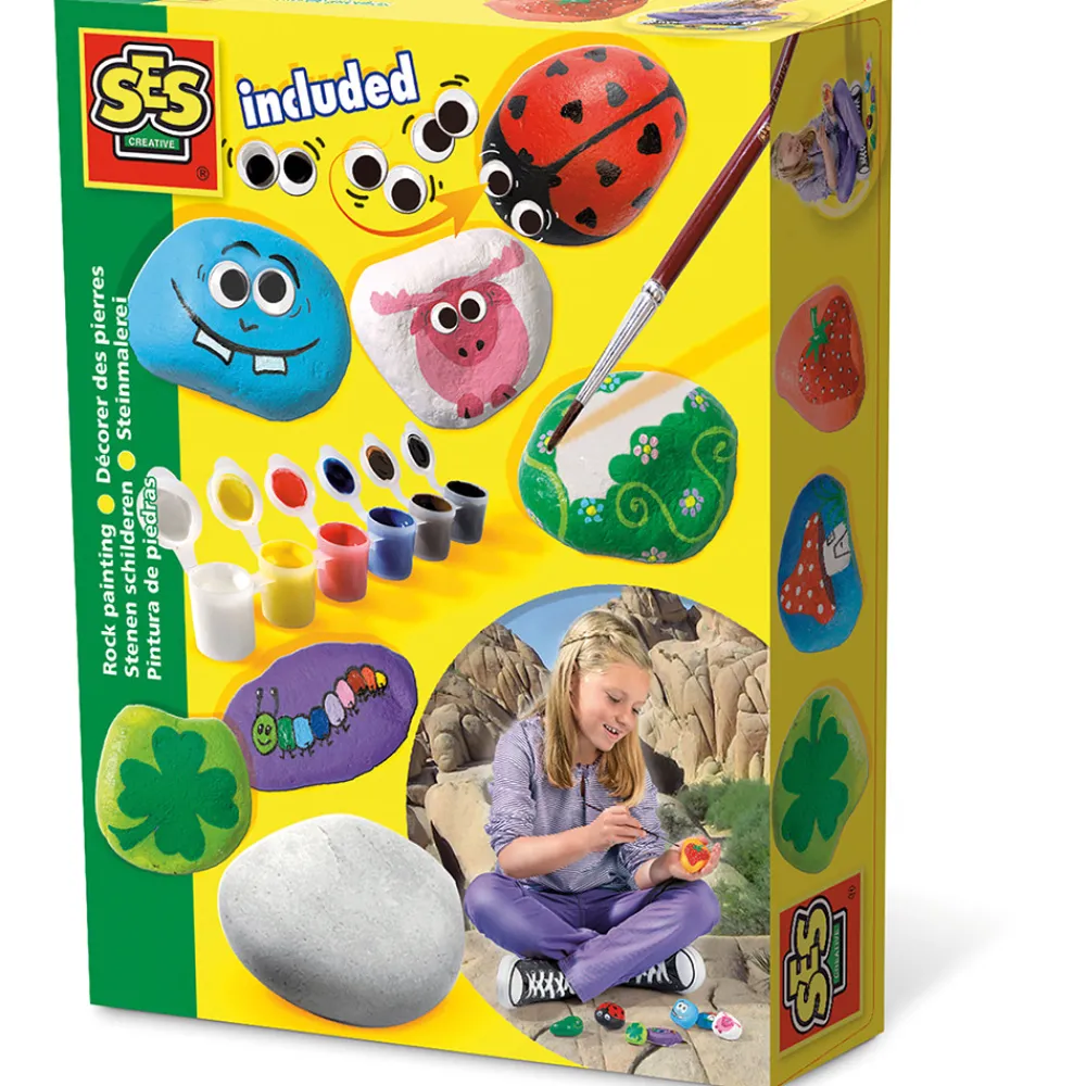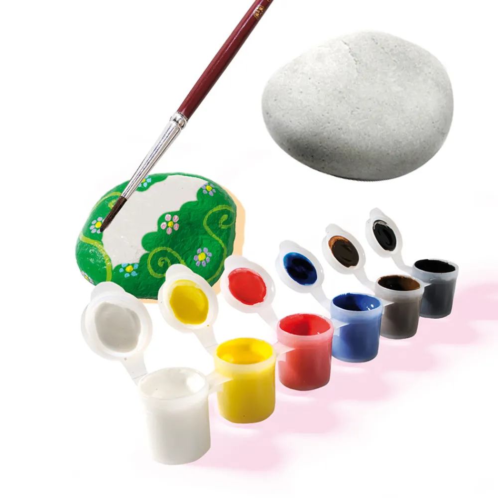 Dette kreative sæt indeholder alle materialer til at male en sten og dekorere den. Lav forskellige varianter med de 6 grundfarver og påfør de sjove øjne, og giv stenen en identitet.