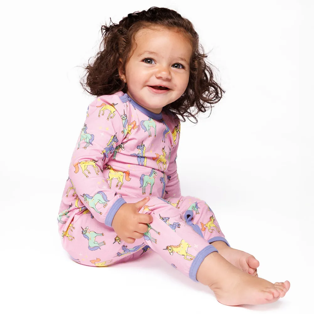 Heldragt til baby med enhjørninger, produceret i en økologisk og strækbar bomuldsjersey. Heldragten har en normal pasform med kuvertlukning og trykknapper, samt ribkant i hals og ærmer.