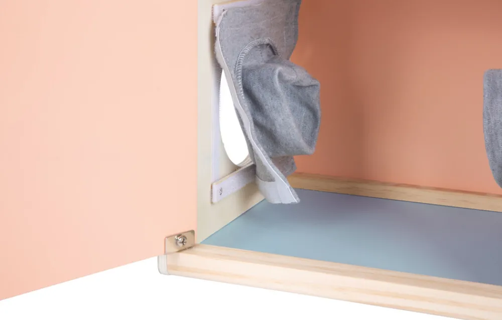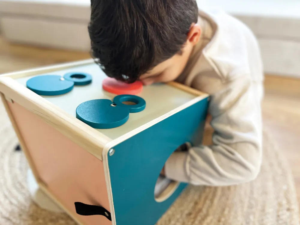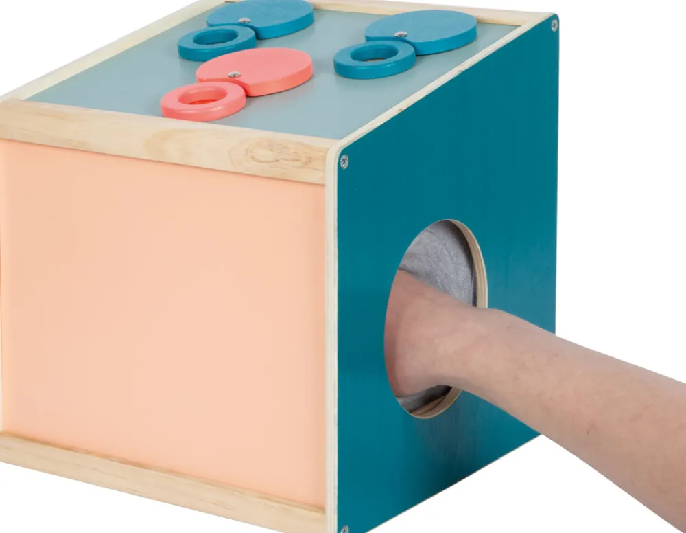 Skærp dine sanser på en sjov måde! Denne generøse sensoriske fældningskasse fra “Sensory” produktlinjen har to åbninger på siden og giver masser af muligheder for at udforske genstande ved hjælp af berøring, syn, lugt og hørelse. Et forstørrelsesglas, en kalejdoskoplinse og en rød linse giver dig mulighed for at se genstande inde i kassen på en ny måde. Den skrå overside af æsken gør det nemt at se igennem og røre ved genstande. De tre linser indkapslet i træ kan nemt fjernes, så åbningerne i toppen af æsken kan bruges til at se, lugte og lytte. Mængden af lys, der tillades ind i kassen, kan styres via åbningsvinklen på bagdøren og den øverste sommerfugleåbning. Genstande kan placeres i denne trækasse gennem bagdøren med en magnetisk lås. Ærmer lavet af stof på sideåbningerne blokerer udsynet ind i kassen. Takket være deres elastiske stof kan ærmerne bruges af både børn og forældre. Det er et taktilt, visuelt og lugtende sansespil, der tilbyder gættesjov for enten én eller op til ni spillere. Ærmebåndene er fastgjort via krog-og-løkkestykker, hvilket gør dem aftagelige, så de kan vaskes i hånden.