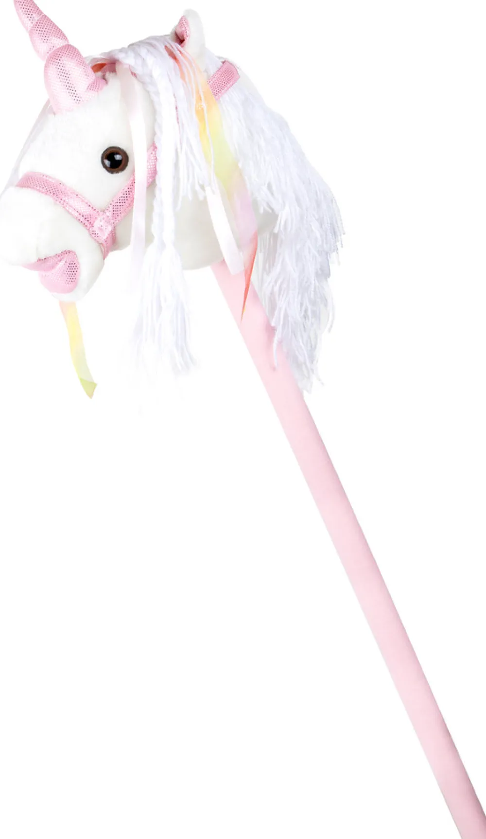 Pinden er beklædt med blødt stof og farverige bånd flagrer i manken. Når dens højre øre trykkes ned, vrinsker den tre gange. Batterier medfølger.
