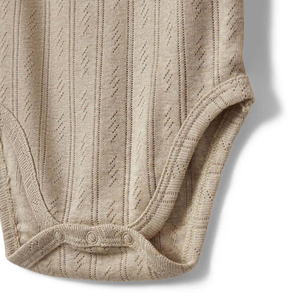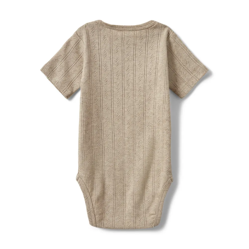 Elegant Sofie Schnoor body med korte ærmer i naturlige nuance. Bodyen er udsmykket med et smukt hulmønster, der tilføjer et stilfuldt touch. Den er udstyret med praktiske trykknapper ved venstre skulder og mellem benene for nem påklædning.