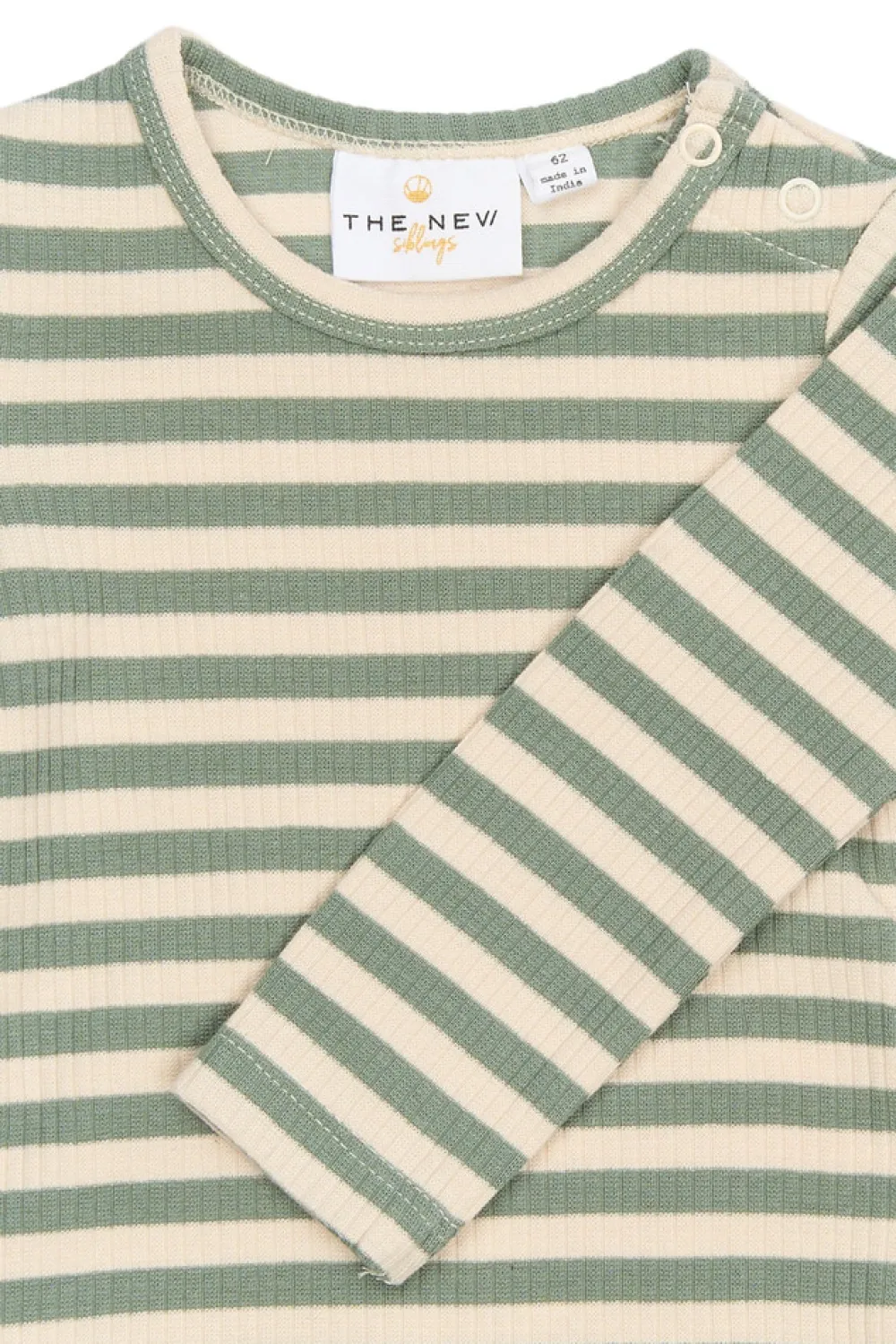 Denne langærmede body fra THE NEW Siblings er en blød og praktisk garderobe, der er vigtig for de små. Den har et klassisk stribet design og en slim pasform, hvilket gør den behagelig at have på under andet tøj. Kroppen lukkes med trykknapper ved skulder og bund, hvilket gør det nemt at tage på og skifte. Perfekt til både hverdagsbrug og leg.