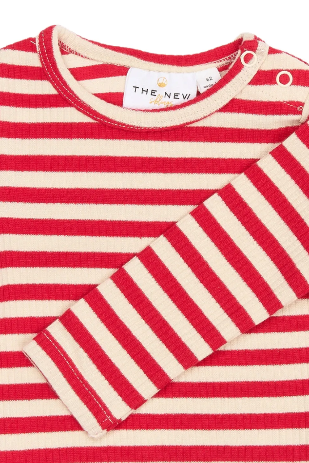 Denne langærmede body fra THE NEW Siblings er en blød og praktisk garderobe, der er vigtig for de små. Den har et klassisk stribet design og en slim pasform, hvilket gør den behagelig at have på under andet tøj. Kroppen lukkes med trykknapper ved skulder og bund, hvilket gør det nemt at tage på og skifte. Perfekt til både hverdagsbrug og leg.