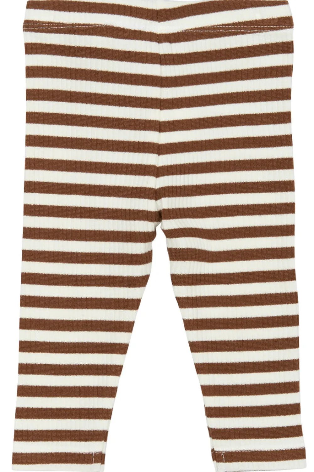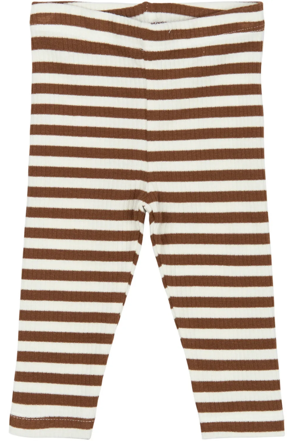 Ribstrikkede baby leggings i brune og hvide striber. Disse basis leggings fra THE NEW siblings er daglige nødvendigheder og kan bruges som hverdagsbeklædning for et behageligt outfit. Talje båndet er elastisk, så det skaber komfort for dit barn til at lege og udforske.