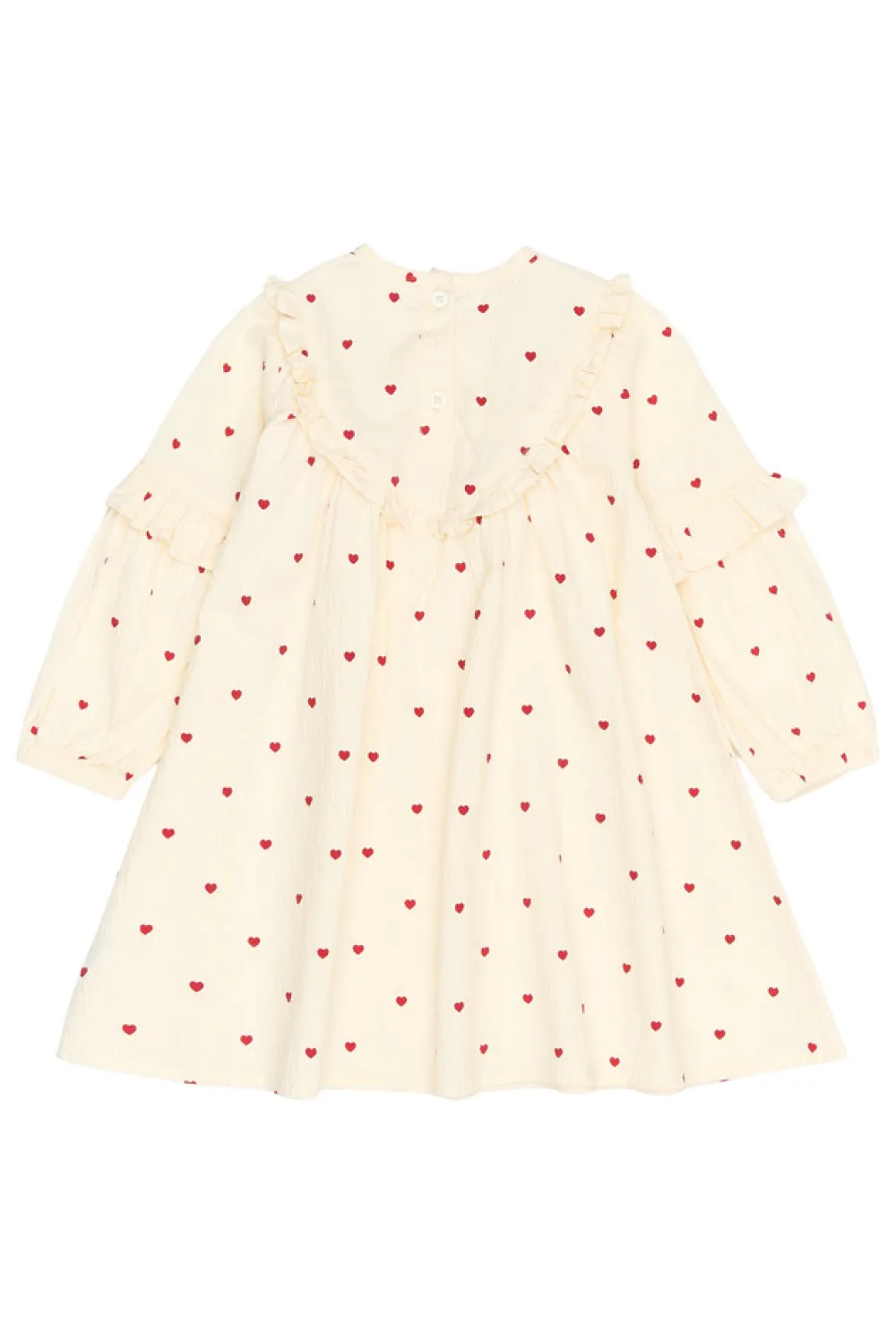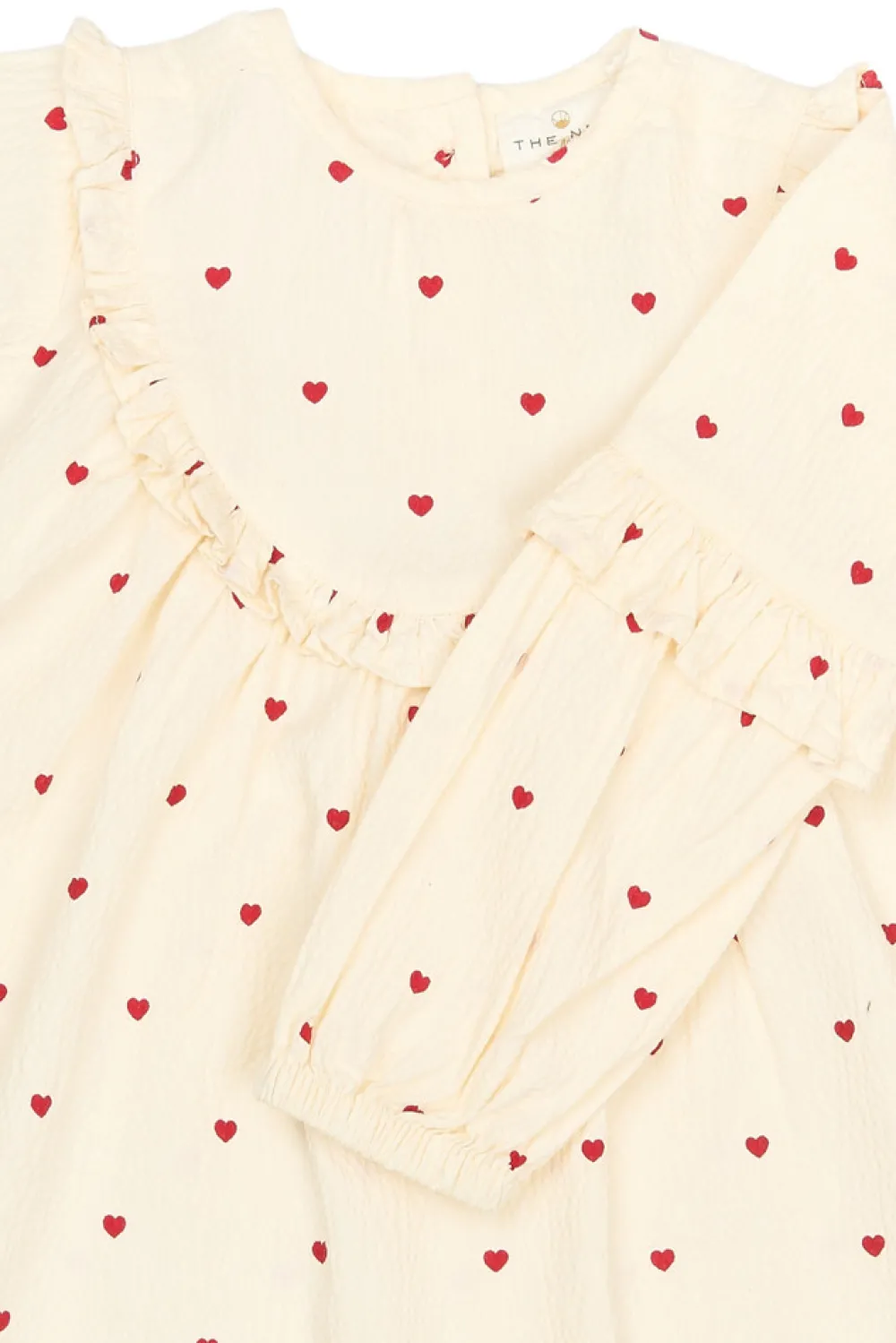 Denne kjole fra THE NEW Siblings er både romantisk og behagelig – perfekt til hyggelige og festlige lejligheder. Den har et sødt all-over hjerteprint og delikate flæsedetaljer langs brystet og ærmerne, hvilket tilføjer et feminint og legende touch. Kjolen har lange ærmer og en let A-form, der giver stor bevægelsesfrihed og en blød silhuet.