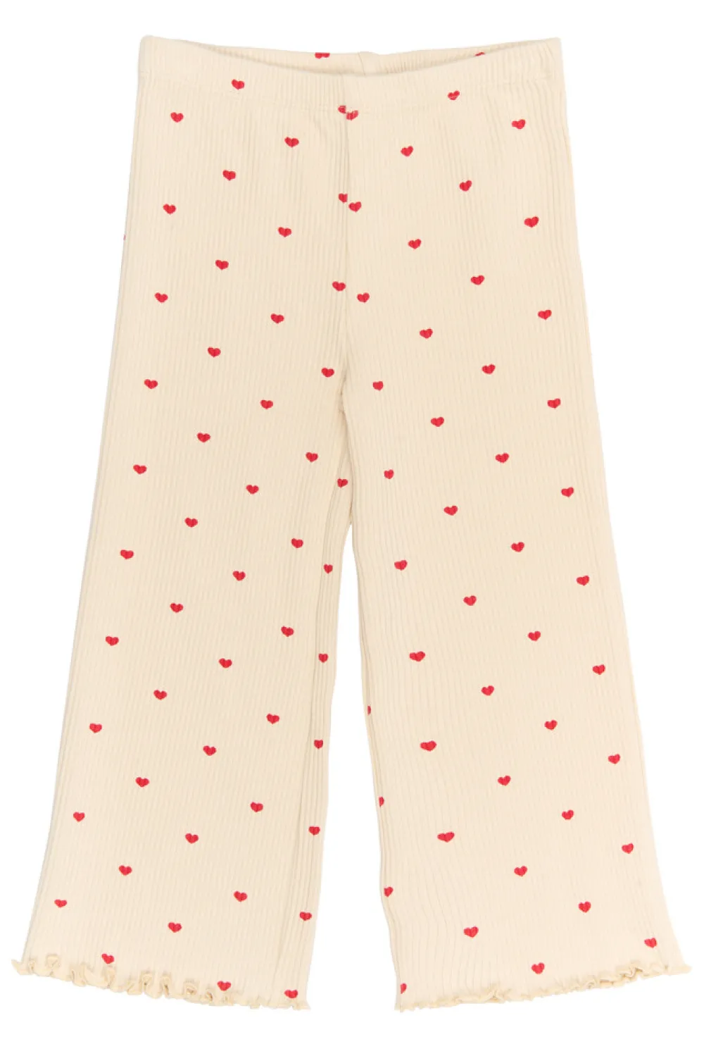 Disse brede ribbukser fra THE NEW Siblings er både legende og behagelige – ideelle til hverdagsbrug med et stilfuldt twist. Med et charmerende hjerteprint og feminine salatkanter ved anklerne tilbyder de en blød og fleksibel pasform med en elastisk linning. Sæt dem sammen med den matchende TNSTRhea Rib Tee for et komplet og koordineret look.