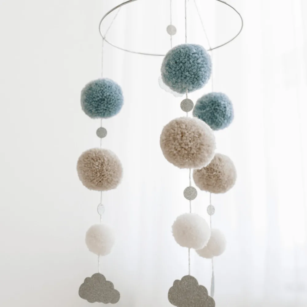 Smuk kombination af håndlavede uld pom poms og skinnende detaljer engagerer din babys fascination af form og farve. Neutrale og pastelltoner giver en delikat indretning til babyens værelse