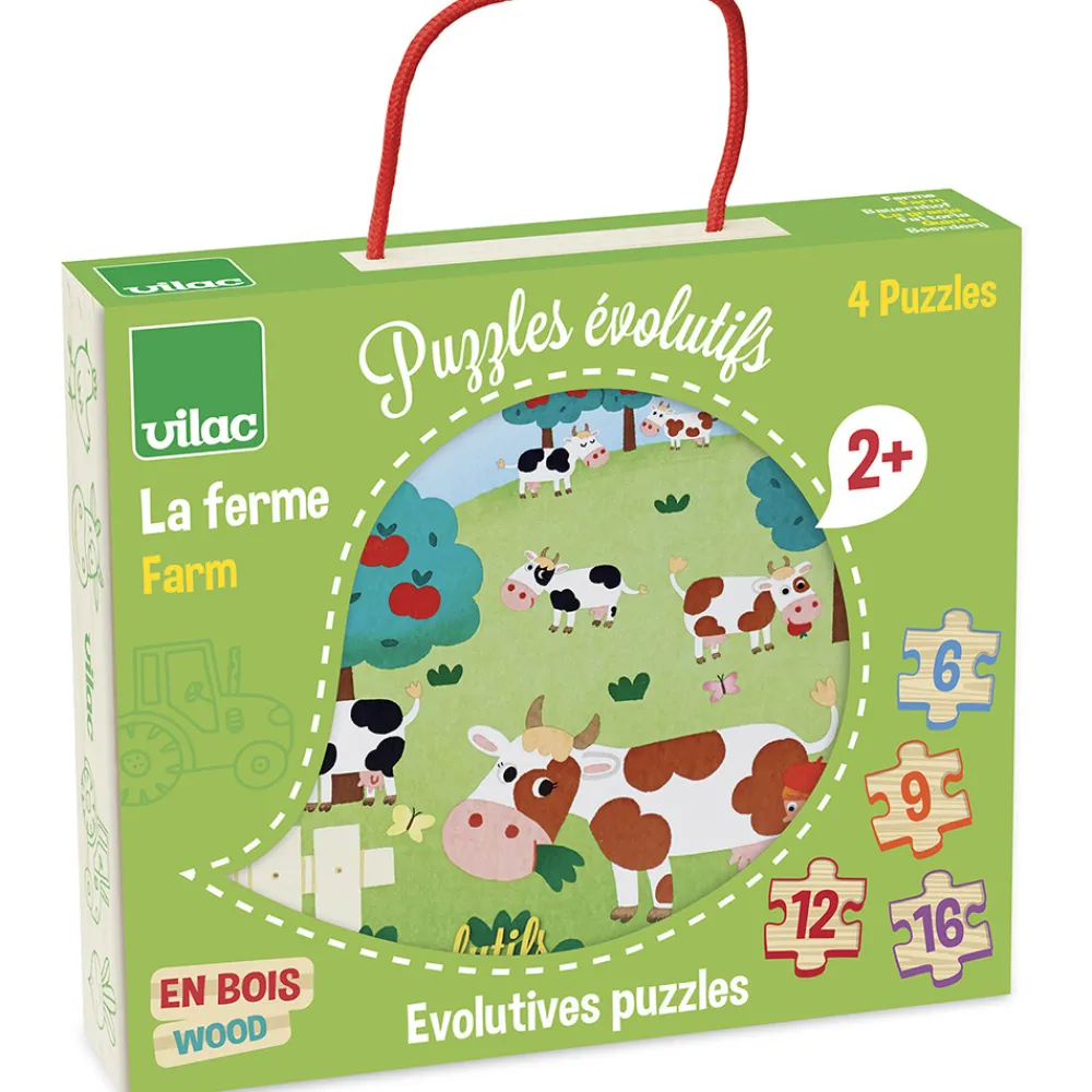 4 puslespil i træ med skønne motiver fra en bondegård. hhv. 6, 9, 12 og 16 brikker. Leveres i fin trææske med skydelåg.