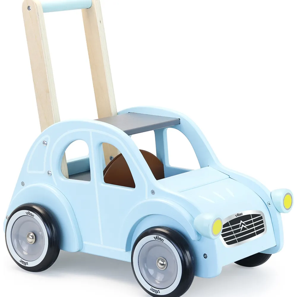 En skøn lyseblå gåvogn formet som en Citroën 2CV. Gåvognen har en spids bagplade som fungerer som en bremse, hvis barnet vipper gåvognen. Leveres usamlet.