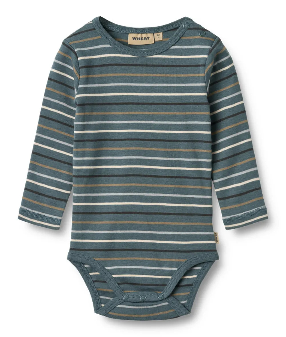 Langærmet body med striber i blødt økologisk bomuld til din baby. Wheats basis body er en sand klassiker i garderoben, når det kommer til småbørn. Denne body har trykknapper på den ene skulder samt i bunden for bedre komfort, når du skal klæde dit barn på. Brug bodyen som den inderste del i ethvert outfit, da den er blød at have tæt på huden. Du kan style bodyen afhængigt af vejr og årstid ved blandt andet at bruge den under et par smækbukser, leggings/bukser eller på kølige dage med en sweater/strik udover.