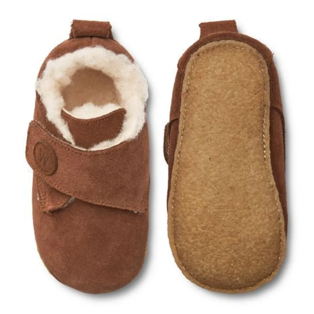 Varme og hyggelige hjemmesko med velcrolukning og uldfoer til din baby.