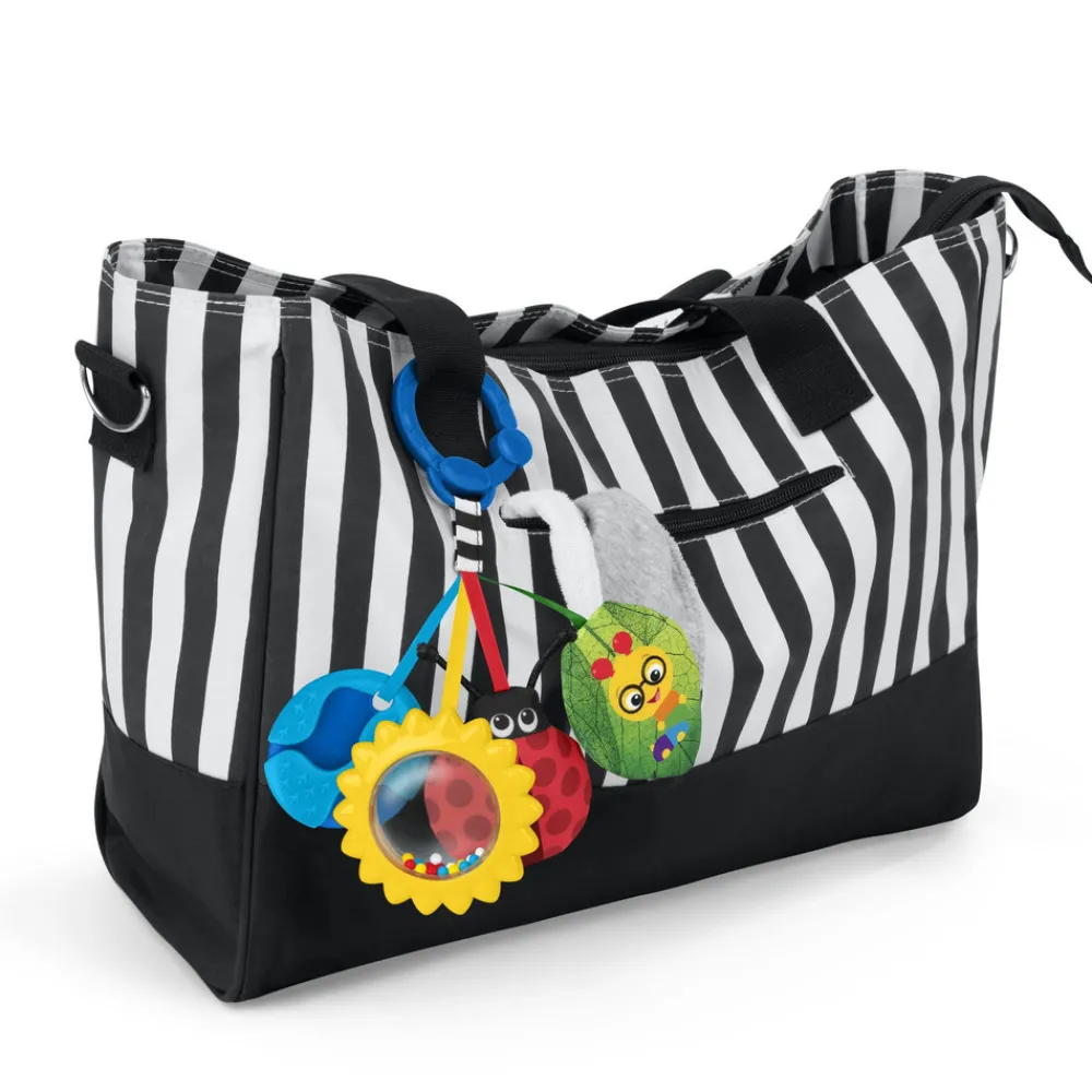 Til spædbørn fra 0 måneder; med den medfølgende clips kan legesættet nemt fastgøres til pusletasken på rejsen eller til barnevognen.