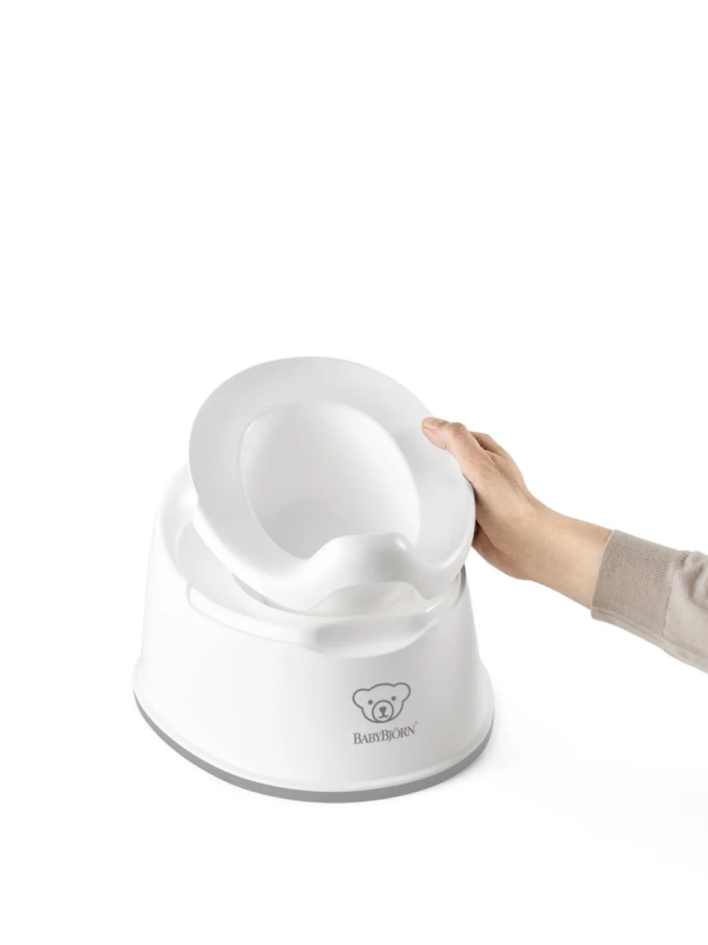 BabyBjörn Smart potte for ideel pottebrug. Smart potten er BabyBjörns nyeste skud på stammen af potter. Den er den perfekte kombination af funktionalitet og enkelthed. Den er lille og dog stabil nem at tømme og rengøre. BabyBjörn Smart potten er den ideelle potte i et mindre badeværelse. Den fylder minimalt og er nem at tage med. Med det ergonomiske design og de bløde linier er Smart potten behagelig for dit barn.