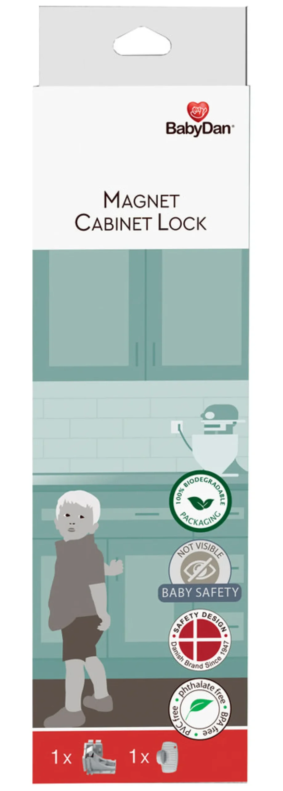 Magnetlås. Forhindrer små børn i at få adgang til skuffer og skabe. Kan bruges på døre og skuffer med en front-tykkelse på op til 25mm. Magnetlåsen er udelukkende beregnet til indendørs brug i hjemmet. Magnetnøglen bør opbevares udenfor børns rækkevidde. Emballagen er 100% biologisk nedbrydelig, Cradle to Cradle cerfificeret .