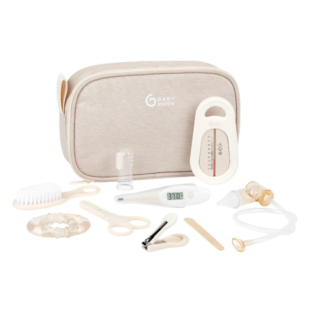 Babymoovs plejesæt samler alt det essentielle til daglig omsorg for din baby i én praktisk løsning. Dette sæt, som er nøje sammensat til forældrenes behov, indeholder ni tilbehør: en neglefil, en innovativ næseaspirator med suge-mundstykke, en beroligende bidering, en blød hårbørste, en børnetandbørste, et badetermometer, et rektaltermometer, negleklippere og en sikkerhedssaks med afrundede spidser.