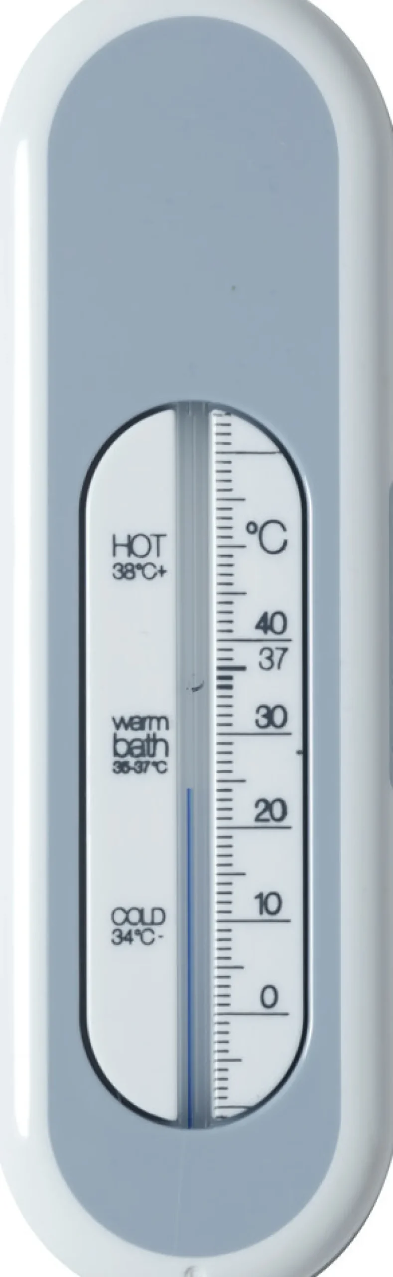 Dette termometer er meget præcist. Den ideelle temperatur på badevandet til den nyfødte er 37 grader, som også er markeret med små pile på termometret. Badetermometeret er lavet af PS (polystyren)