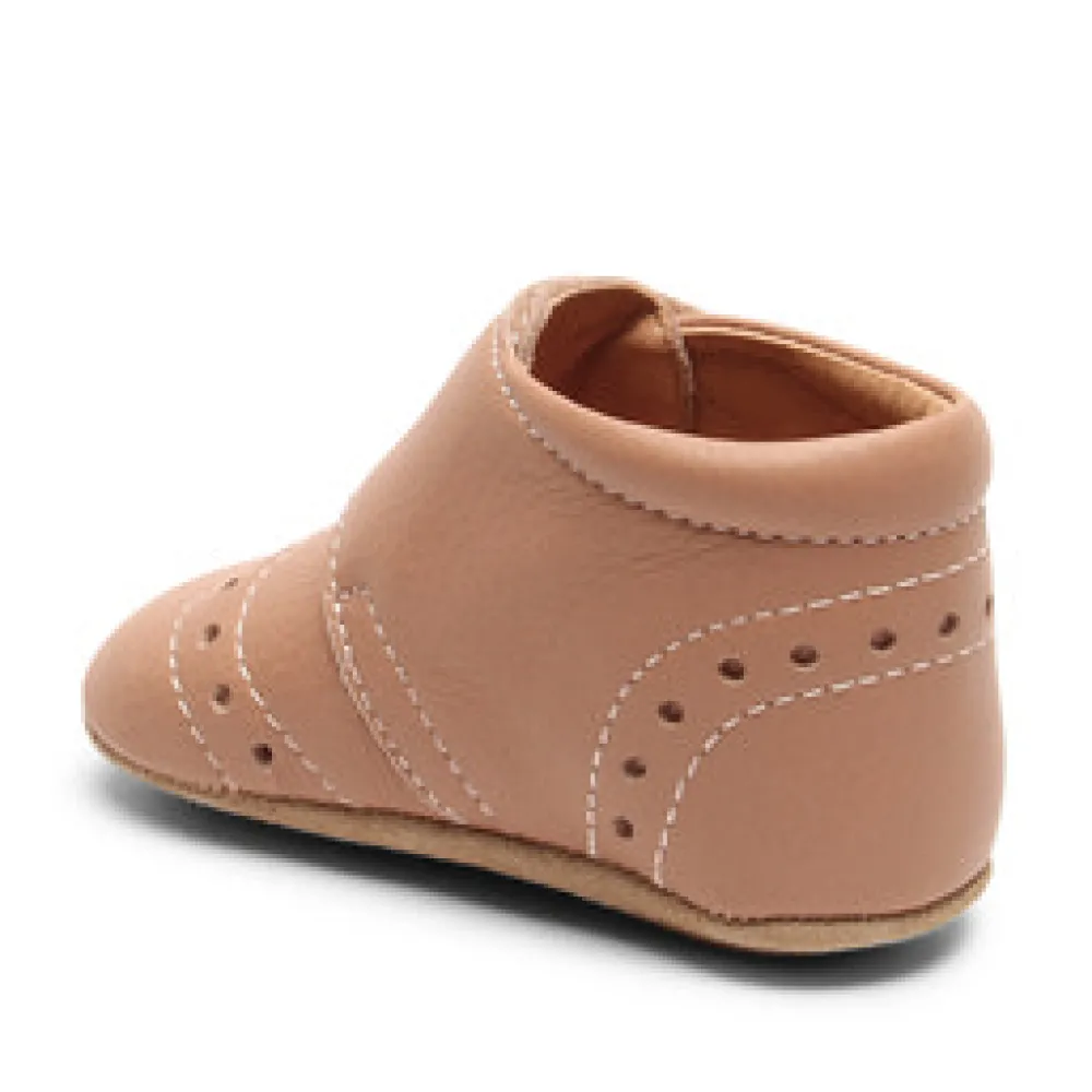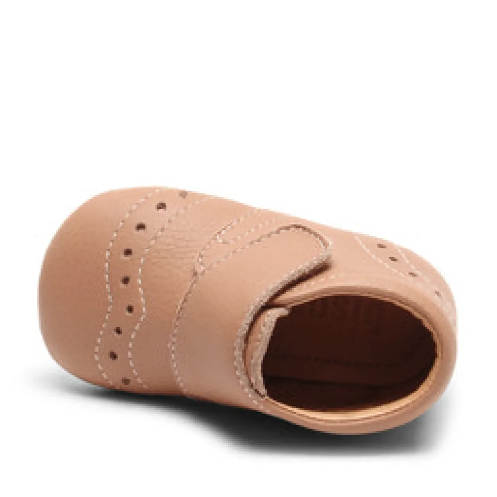 Hjemmesko, som også kan bruges som prewalker med velcrolukning, skindfoer og en blød sål af ruskind og skridsikker gummi, der giver den optimale støtte. Hjemmeskoen er produceret i 100% naturligt og åndbart læder, der er lukket rundt om foden og samtidig giver foden plads til at vokse.