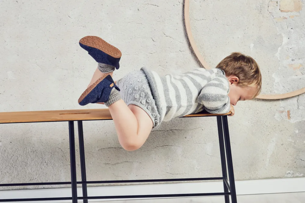 Hjemmesko, som også kan bruges som prewalker med velcrolukning, skindfoer og en blød sål af ruskind og skridsikker gummi, der giver den optimale støtte. Hjemmeskoen er produceret i 100% naturligt uld, der er lukket rundt om foden og samtidig giver foden plads til at vokse.