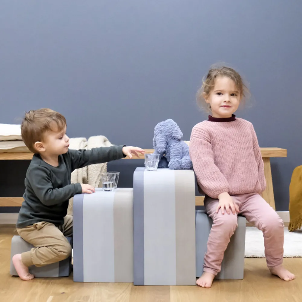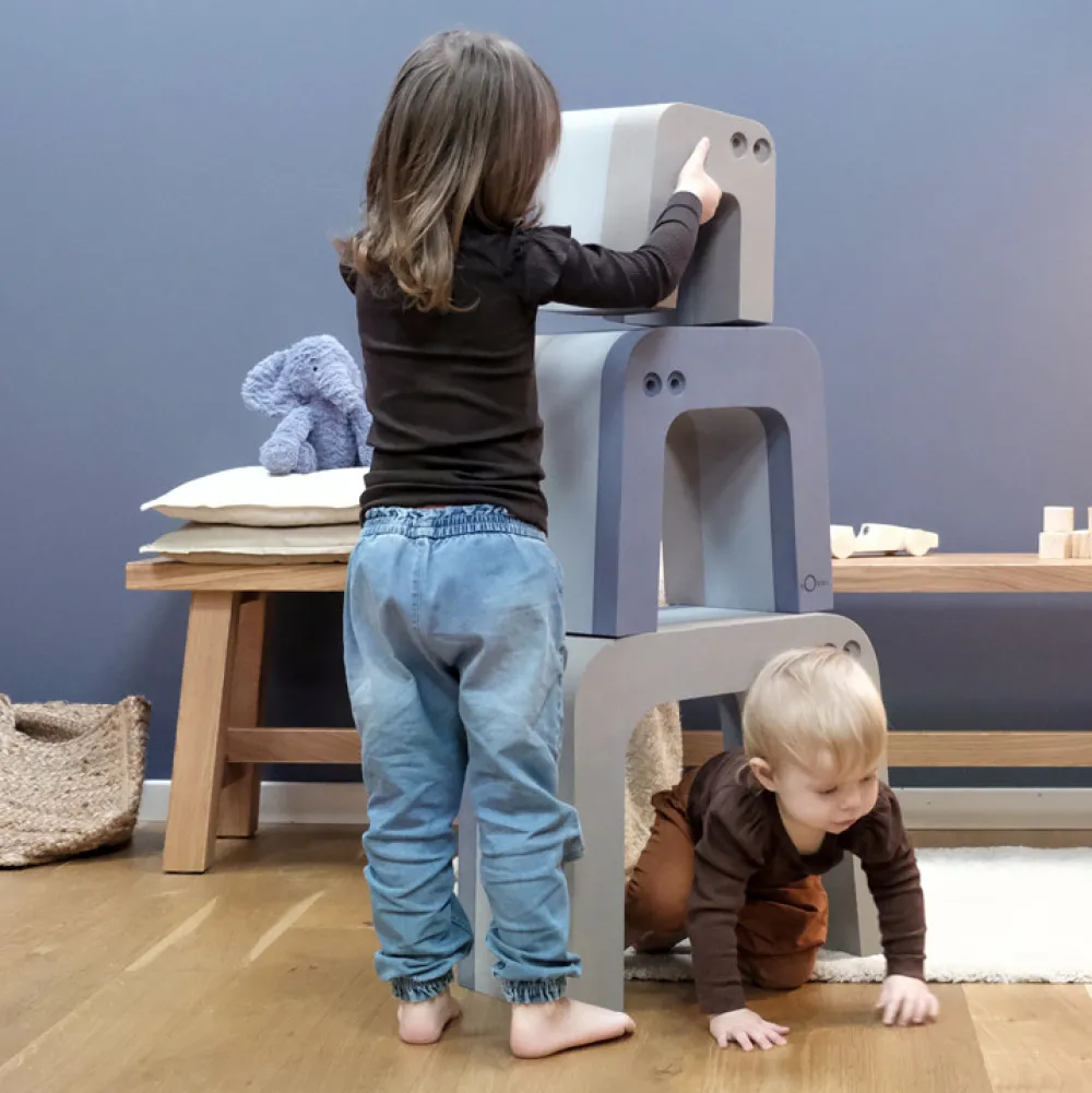Kryb, kravl, rul og hop. bObles Myresluger sætter ikke bare gang i fantasien men også i motorikken, og er et absolut must have til børneværelset! Det er umuligt ikke at forsvinde ind i legen, når barnet kaster sig over Myreslugers fire forskellige tumlemøbler. Styrken ligger i Myreslugers multifunktionalitet – på få sekunder kan den transformere sig fra Gyngestol, trappe og forhindringsbane til bord og stole til te selskabet. To af delene vipper, mens de to andre står fast, og det gør trappe- og skammelfunktionen til en sjov og udfordrende leg for barnet, der samtidig skal forholde sig til ændringen i bredden på trinene for hvert skridt. Sæt den næstmindste del under en af de to større og pludselig har barnet og tumlingen en fantastisk gyngestol eller gyngehest. Når mor og far skal lave en kop te, kan Myresluger blive til en sjov lille kravlegård, når de to store dele ligges på siden og sættes sammen. Her kan den lille baby trygt sidde og vente på sine forældre, mens sanserne bliver stimuleret på det bløde EVA-skum. Kombiner bObles Myresluger med Skildpadde og lad den siddende baby eller tumling få en sjov og sikker vippetur, eller lad Myresluger blive en del af racerbilen på Tumlebræt. Når barnet skal lidt ned i tempo, er Myresluger sjov at stable – og vælte. Ligesom den er perfekt som balancebom, når den bliver lagt på siden og øves linedans. De naturlige farver er omhyggeligt udvalgt, for at skabe rolige, sanselige og inspirerende omgivelser for barnet at lege i, samtidig med at farverne, såvel som tumlemøblerne er tidløse og kan holde til mere end én sæson.