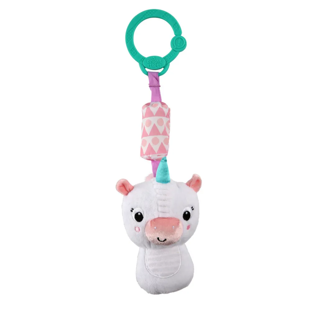Sødeste enhjørninge-rangle. Produktet er med til at udvikle babyens finmotoriske evner og kan monteres i autostolen, i barnevognen, på bilsædet mm. Nem at tage med på farten.