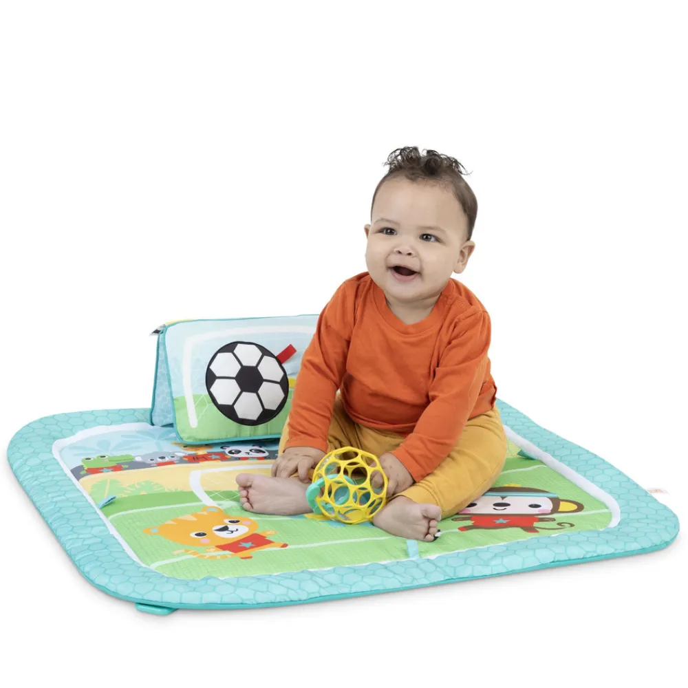 Bright Starts Grip & Kick Oball aktivitetscenter med fodboldtema kan bruges på 4 måder, efterhånden som baby vokser: Baby kan ligge på maven, baby kan ligge og lege, baby kan sidde og lege, eller legemåtten kan tages med på farten; inkluderer blød sparkepude og understøttende pude til, når baby ligger på maven