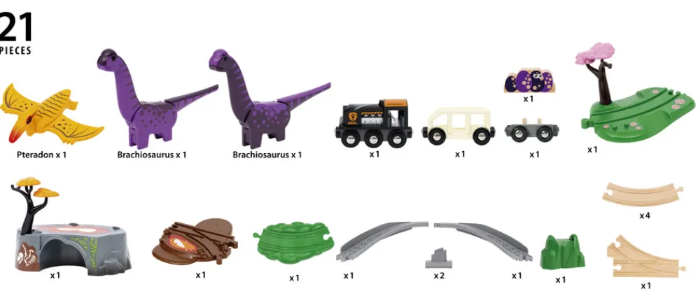 Gå på opdagelse i dinosaurernes fantastiske univers med Brio 36094 Togbanesæt med dinosaurer. Togsættet indeholder 21 dele, som giver mulighed for masser af dinosaur- og togleg med et tog med to vogne, flere dekorative dele, som fx den farlige lavagrotte og skinnerne med grønt græs, samt uendelige muligheder for togleg på tværs af forskellige niveauer. Der medfølger tre farverige dinosaurer med unikke bevægelige dele og klassiske BRIO-magneter til at skabe spændende interaktioner i legen.