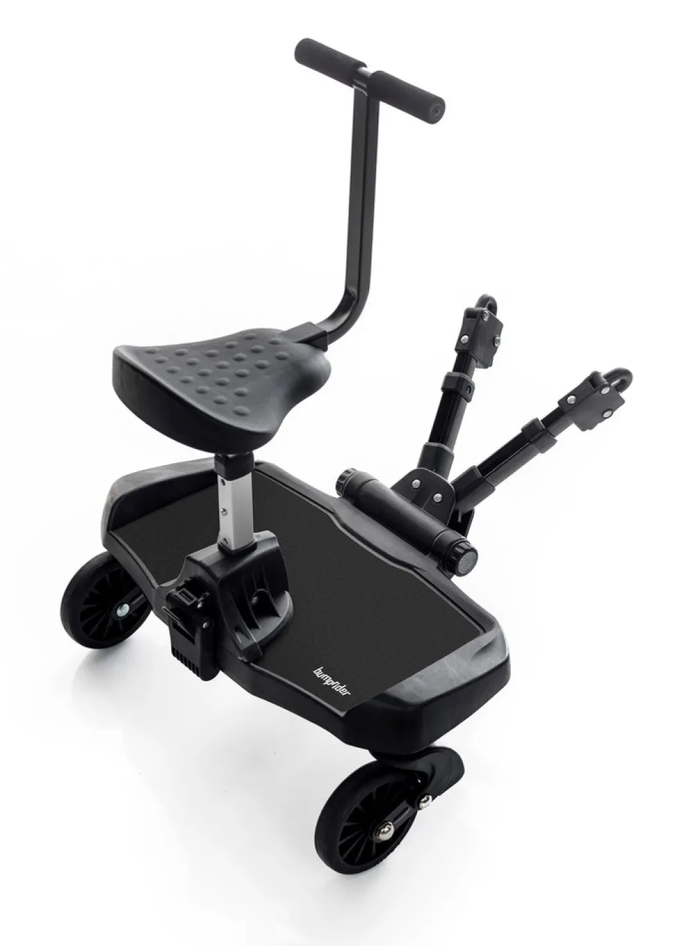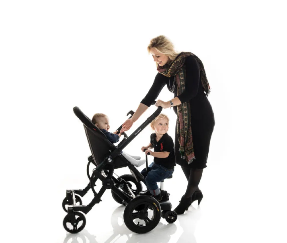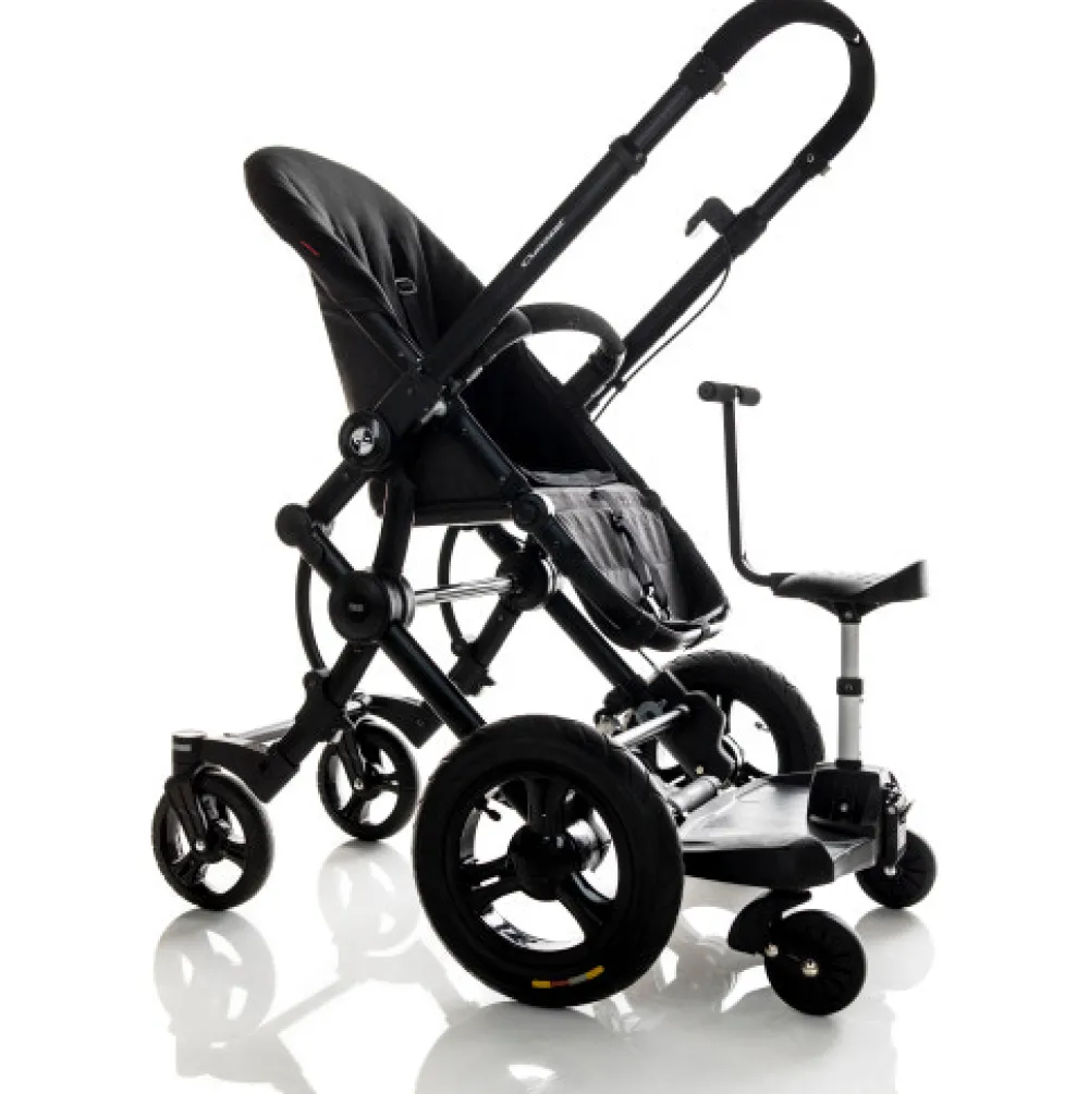 Universalt søskendebræt/ståbræt med sæde, så storebror- eller søster kan tage et hvil undervejs. Sædet er aftageligt, og kan justeres i højden.