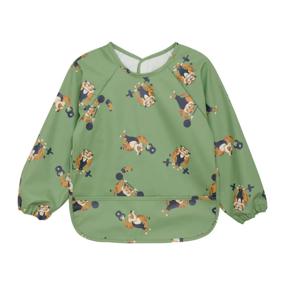 Smart PU-hagesmæk/jakke lavet i recycled materiale. Undgå pletter på dit barns tøj. PU-jakken er utrolig praktisk. Den har velcrolukning i nakken og en opsamlingslomme foran. Praktisk til både spisetid eller ved leg med maling m.m. Med all-over-print. Certificeret i hht. GRS CERES-0366.