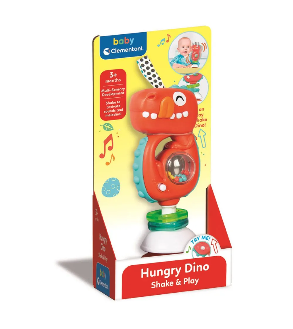 Interaktiv Dinosaur, med sugekop, perfekt til når der skal spises. Ryst ranglen for at høre sjove melodier og lydeffekter. Med maverangle, småpynt og forskellige overflader til at understøtte multisensorisk udvikling.